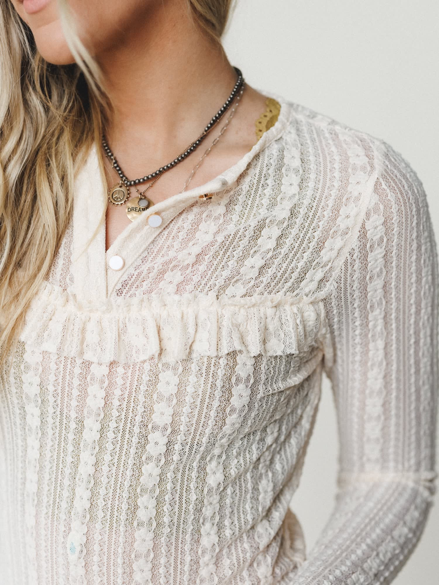 - Quaint Darling Lace Long Sleeve Top features sheer floral texture, soft stretch, and romantic ruffle cuffs