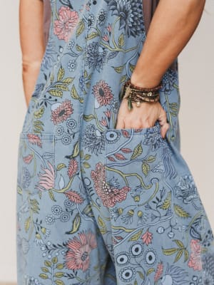 - Includes the High Hopes Slouchy Denim Overalls, featuring a light floral print on faded denim, wide-leg silhouette, side button detail, and front patch pocket—easy, flowy, and full of charm