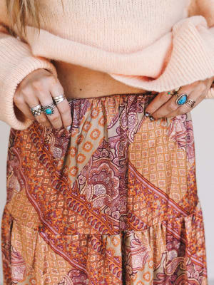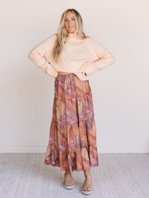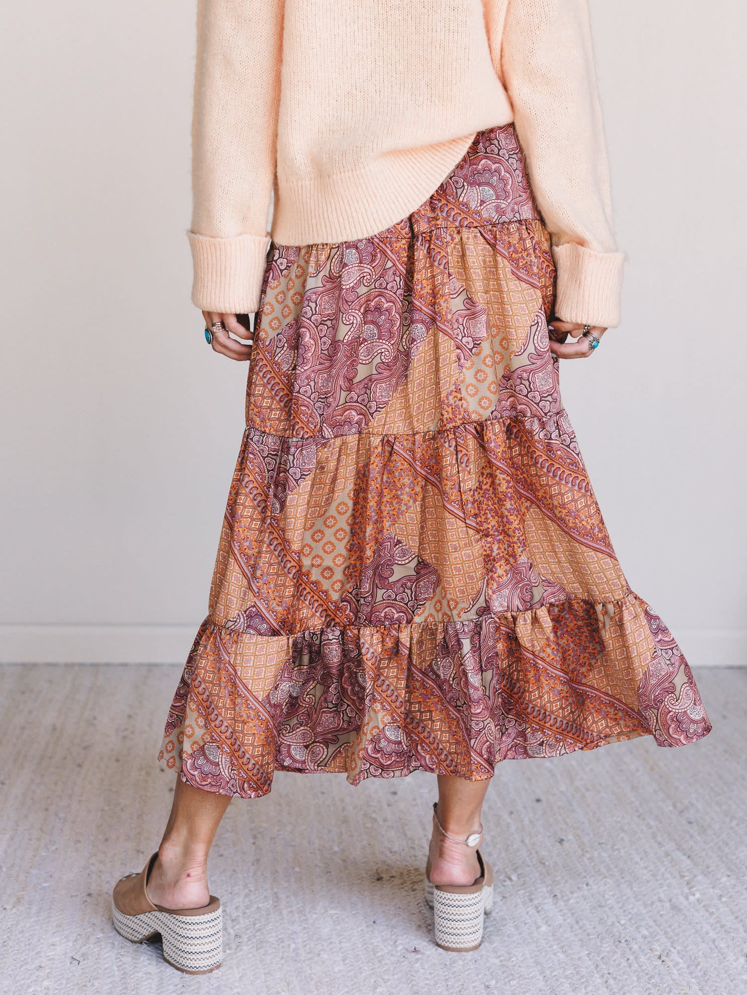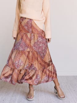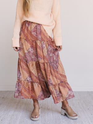 • Flowing tiered midi skirt in a vintage-inspired hazel paisley and patchwork print