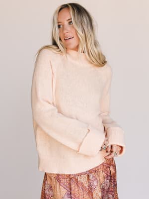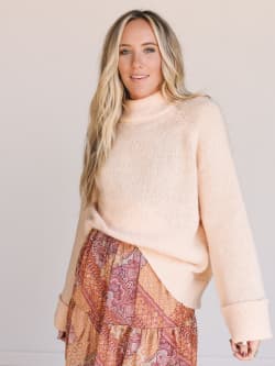 • Brushed knit peach pullover with a slouchy fit and cozy turtleneck collar