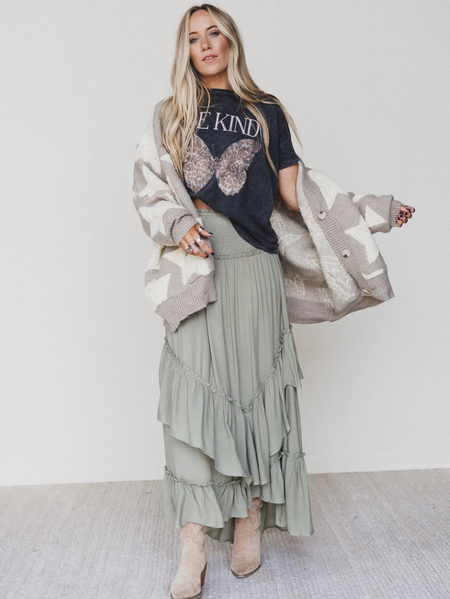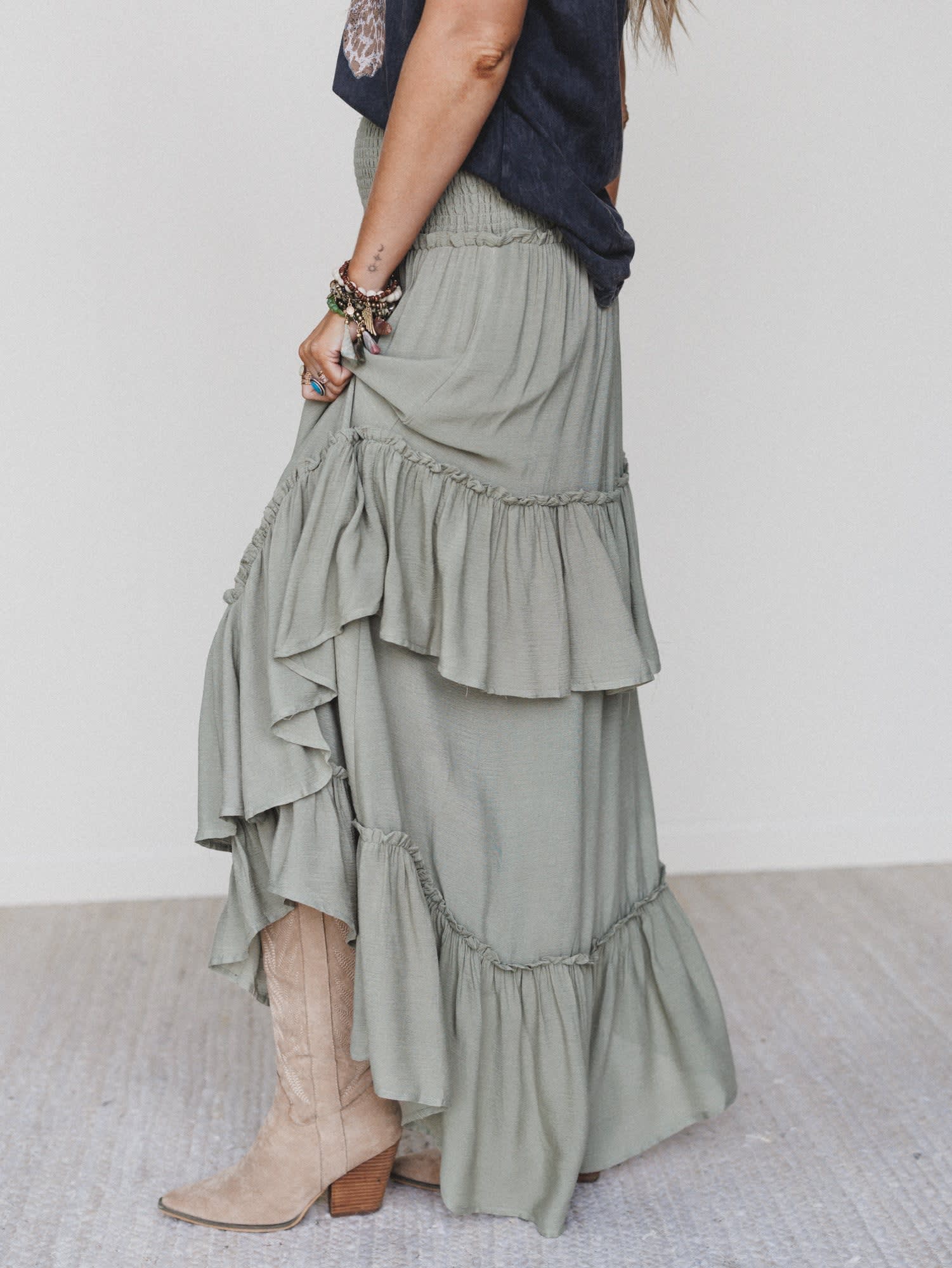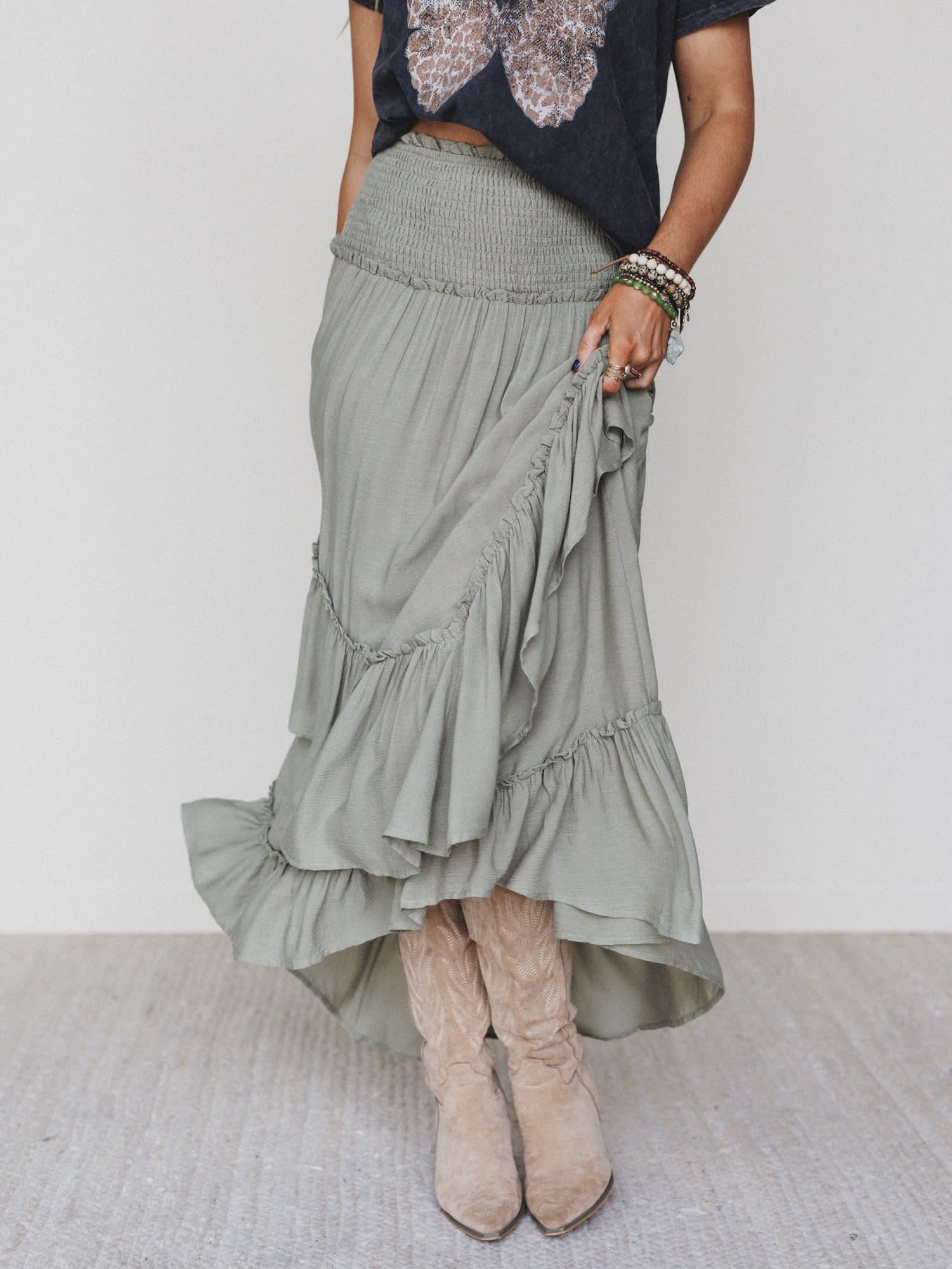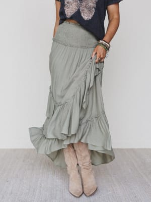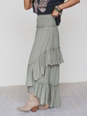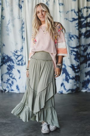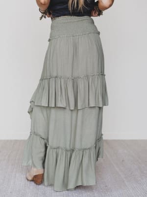 This olive maxi skirt is your new go-to for festival chic looks in a snap.