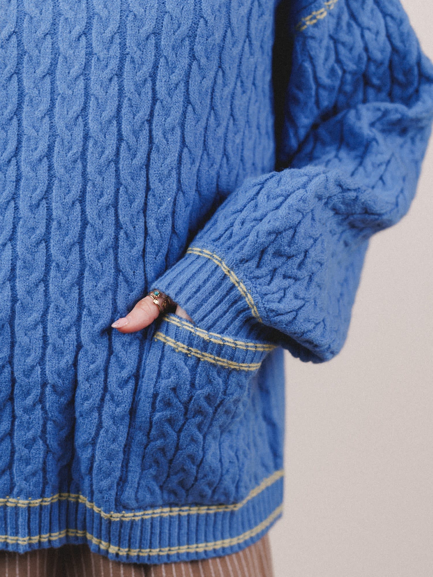 • Chunky cable knit sleeves paired with a smooth knit body for texture contrast