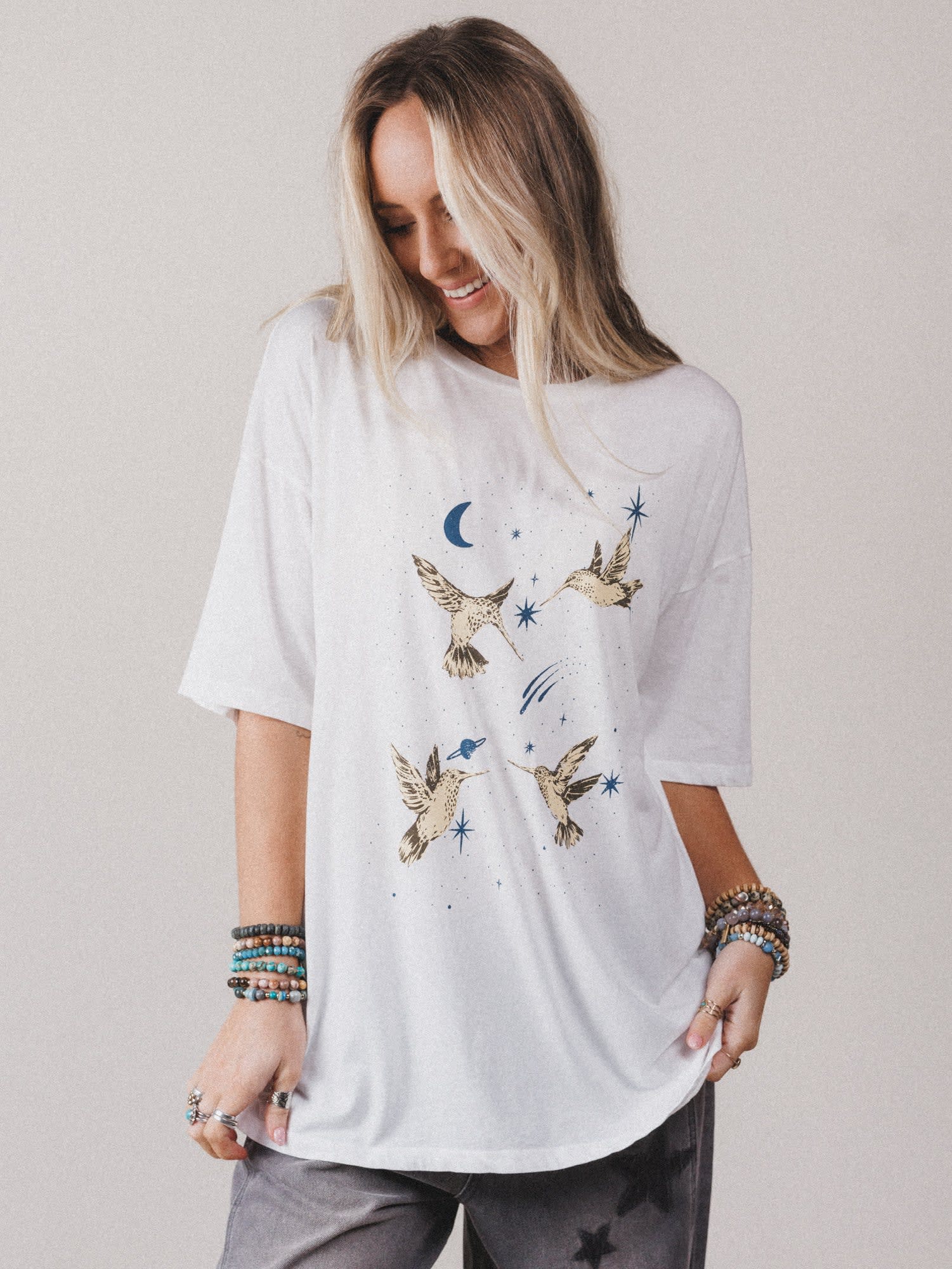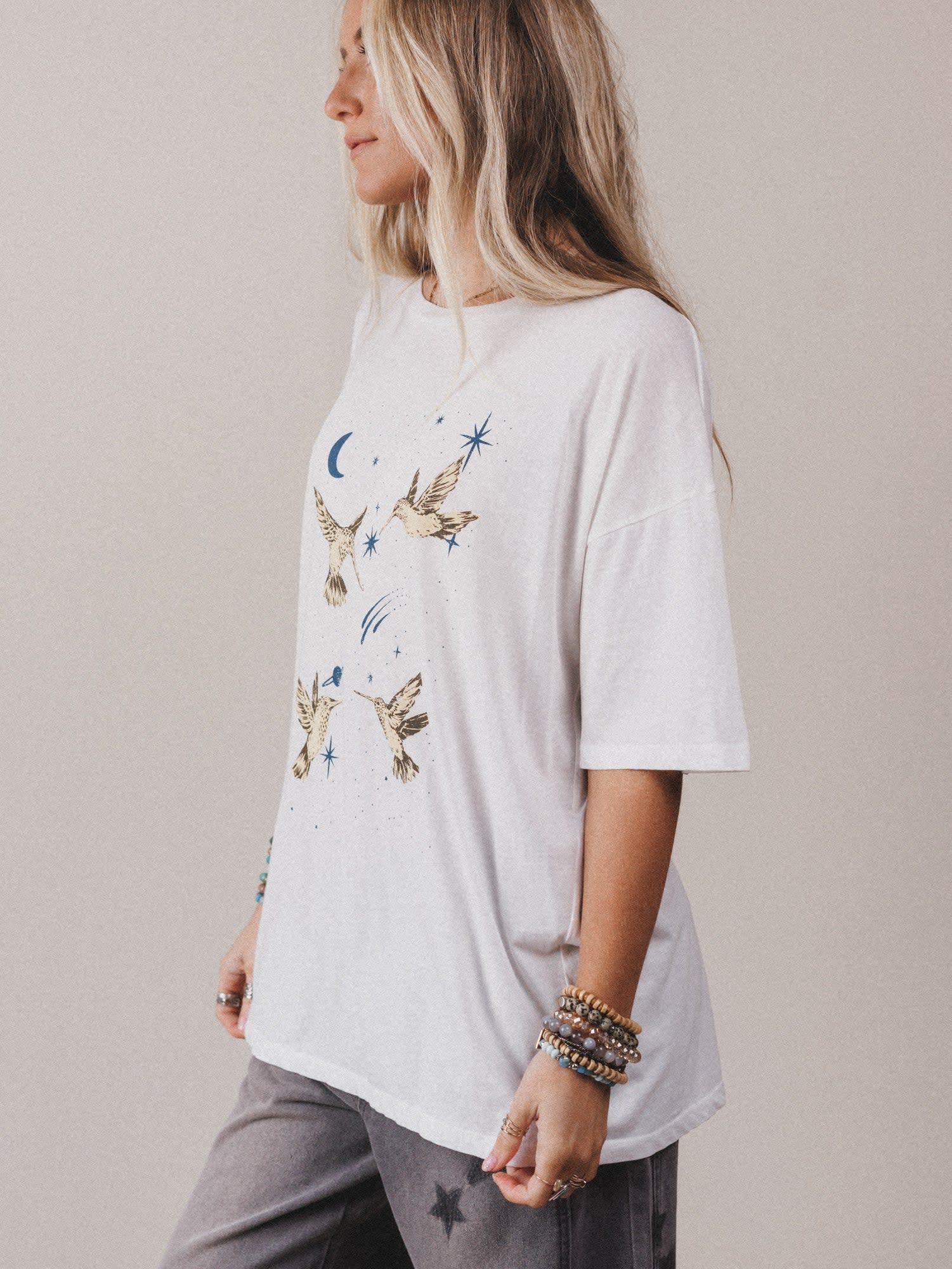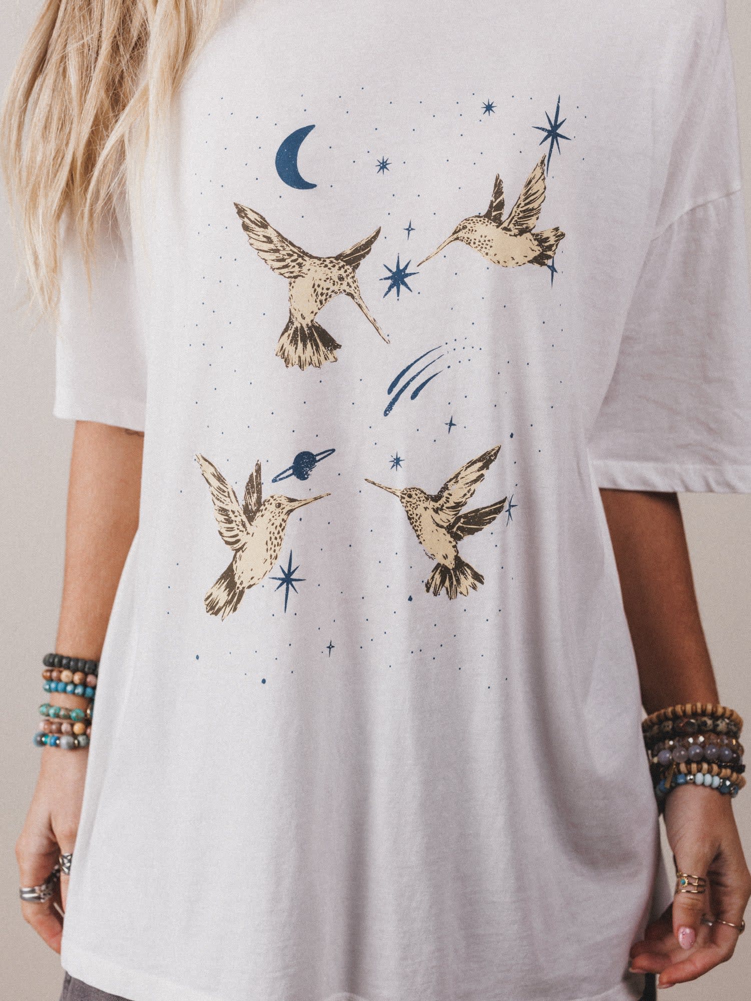 • Vintage-inspired hummingbird and celestial graphic in earthy neutrals + dreamy blues