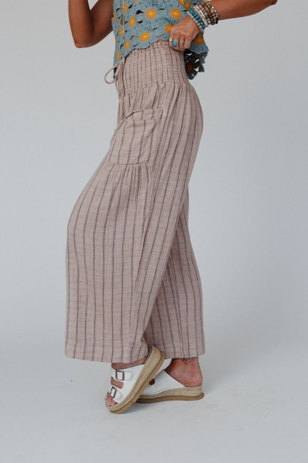 • High-rise elastic smocked waistband with an adjustable drawstring detail
