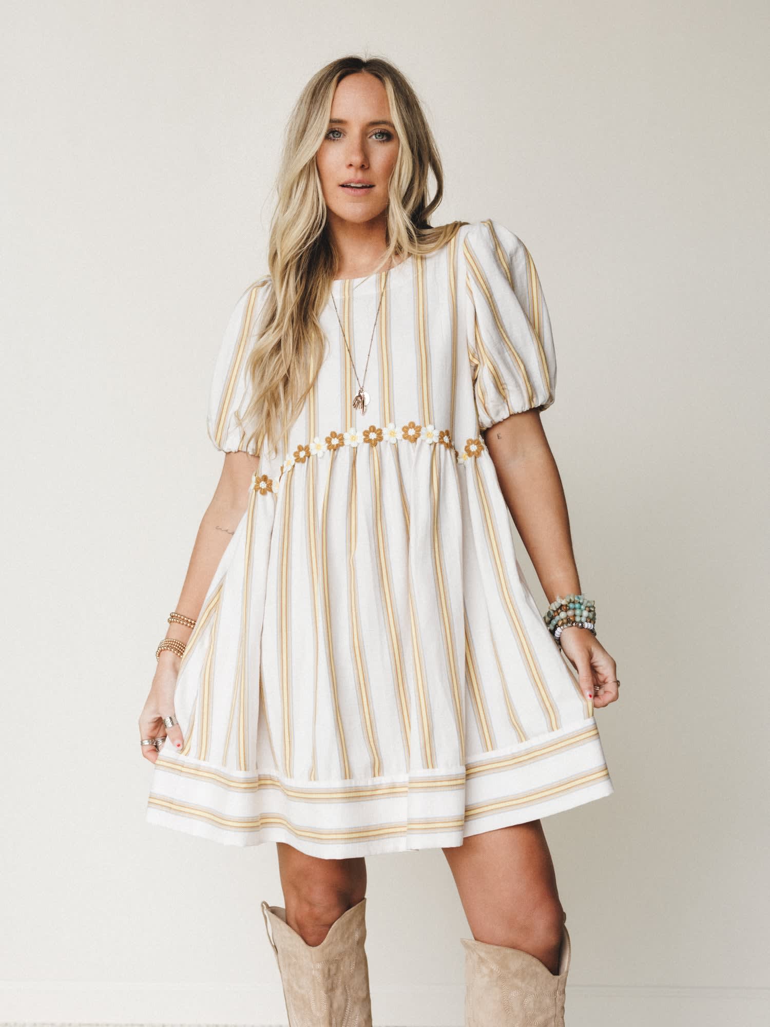 When you're wondering what to wear on a road trip or planning the perfect country concert outfit, this striped boho dress delivers effortless bohemian style with feminine flair. The delicate floral embroidery adds artisan-inspired detail to this free-spirited piece from our boho boutique collection.