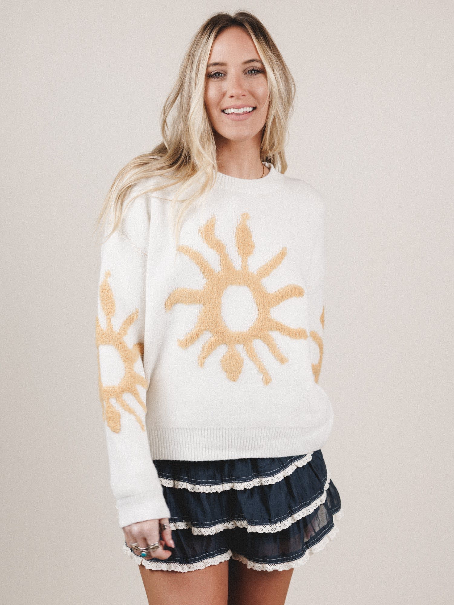 Chase the sun, even on chilly days. The Solar Muse Sweater brings a radiant twist to your winter wardrobe with its bold sunburst design and cozy softness. This feel-good knit is made for golden hour lovers and dreamers alike.