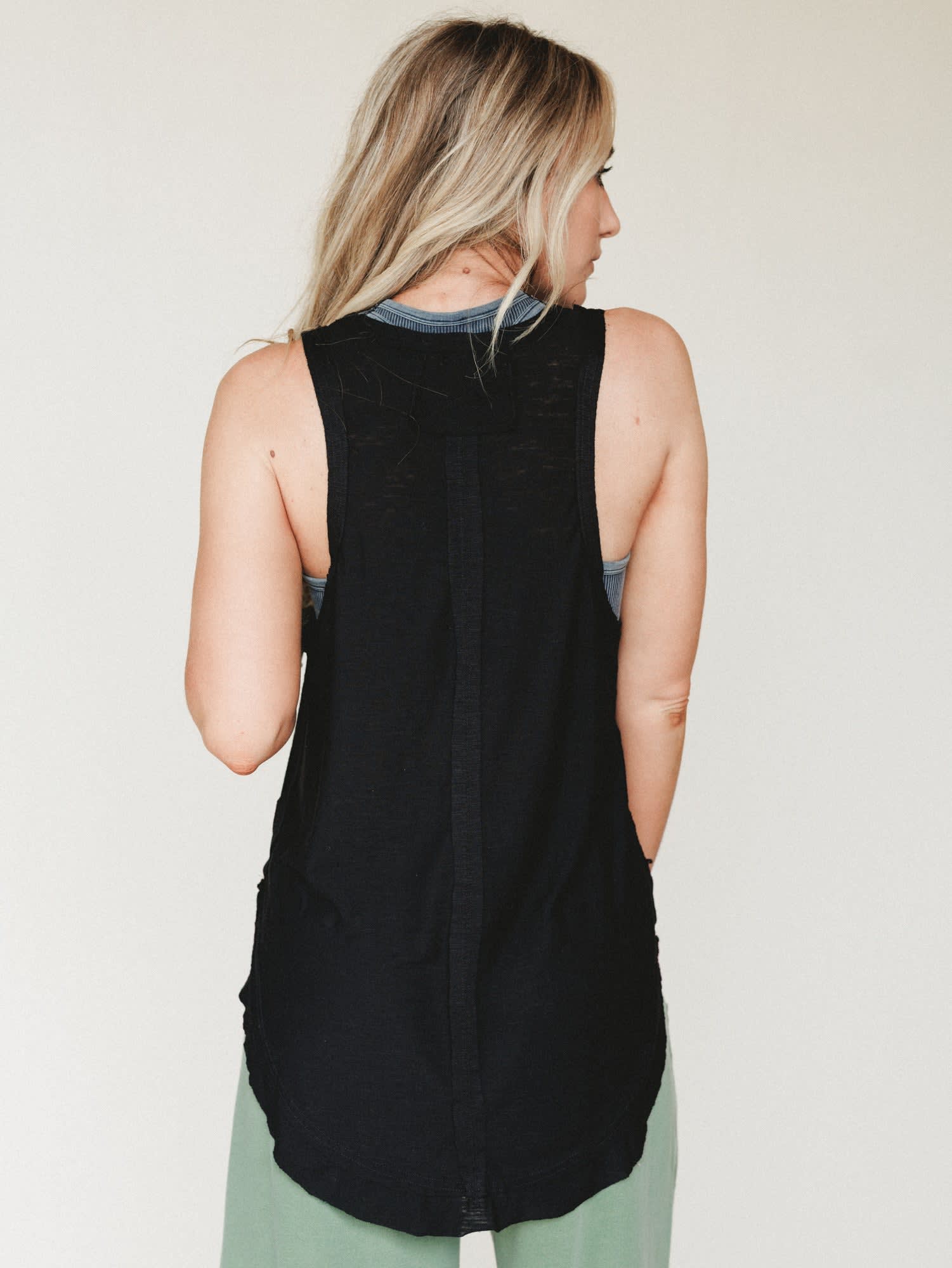 • The Easy Breeze High Neck Tank features a relaxed drape in a dark black with a flattering high neckline and flowy boho fit.