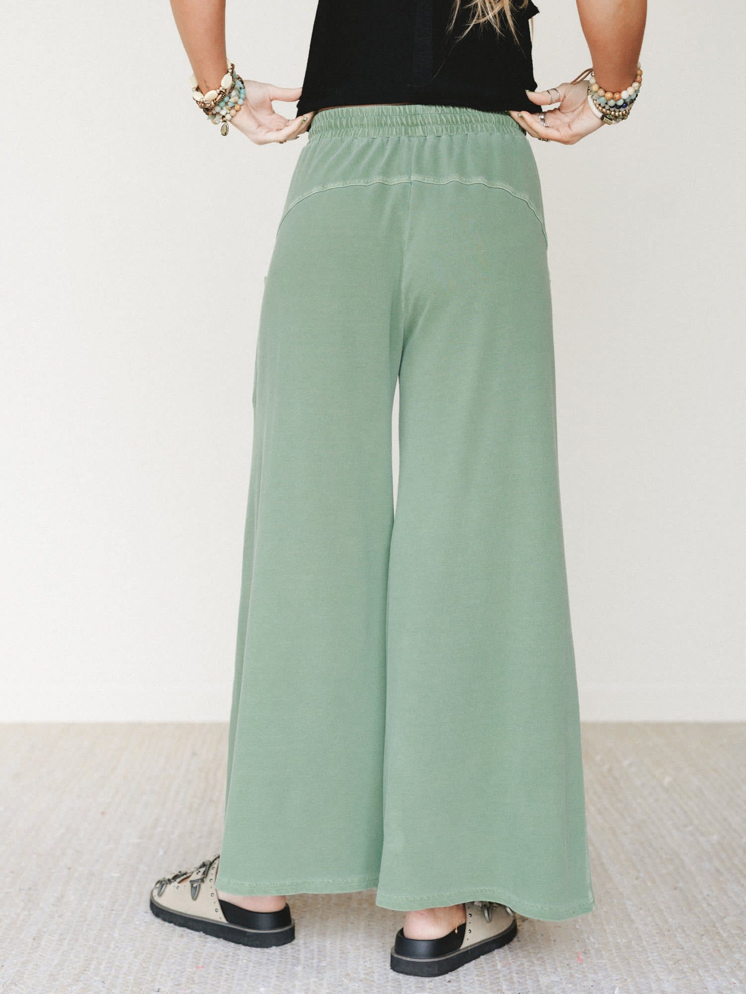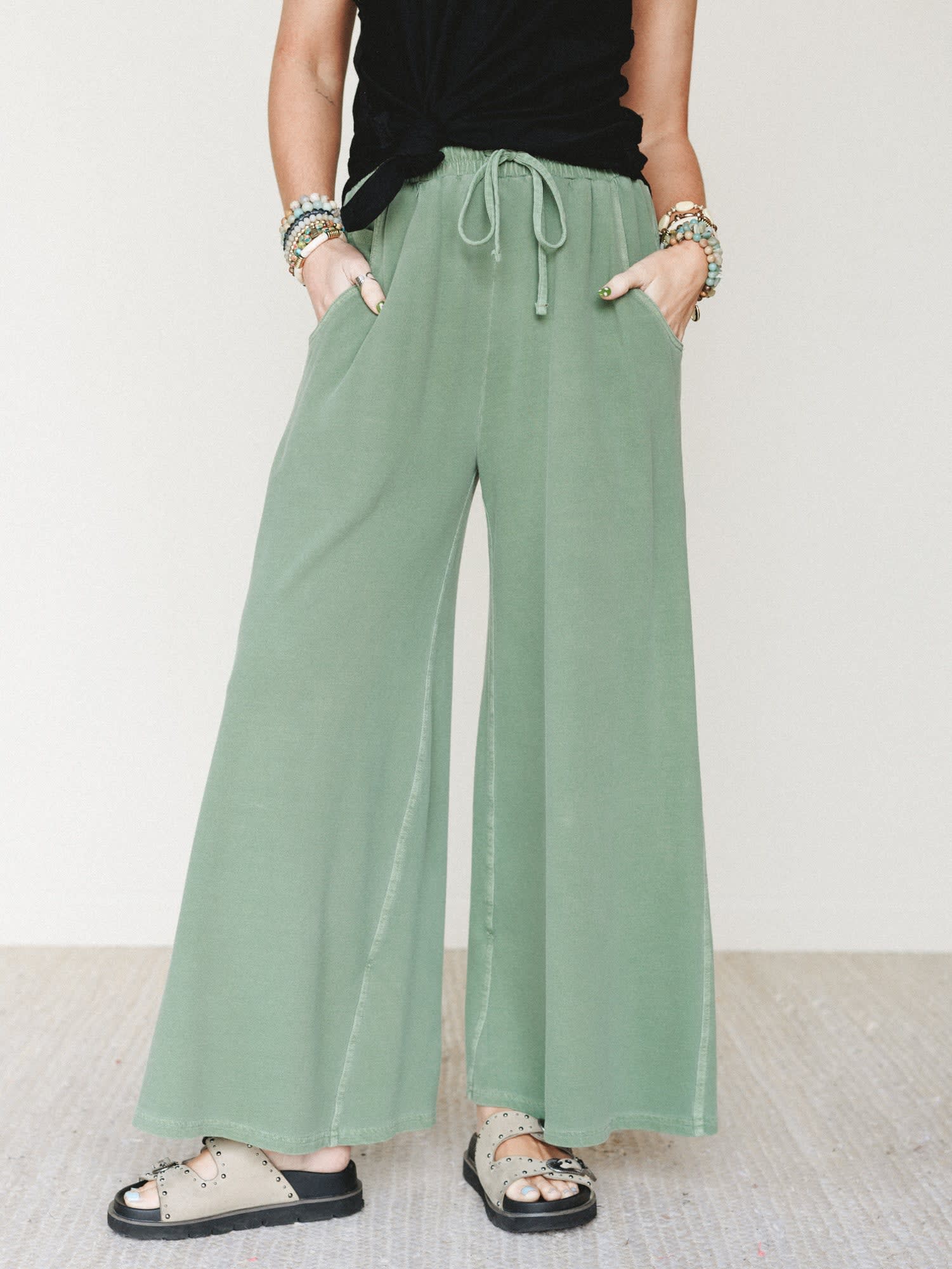 • The Wild Solstice Drawstring Pants bring effortless comfort with a green wide leg silhouette and adjustable drawstring waist.
