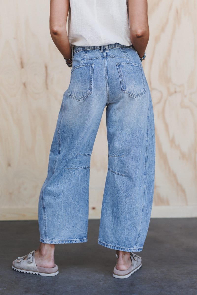 Get in on the barrel leg jeans trend with this pair in rich medium wash.