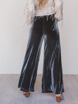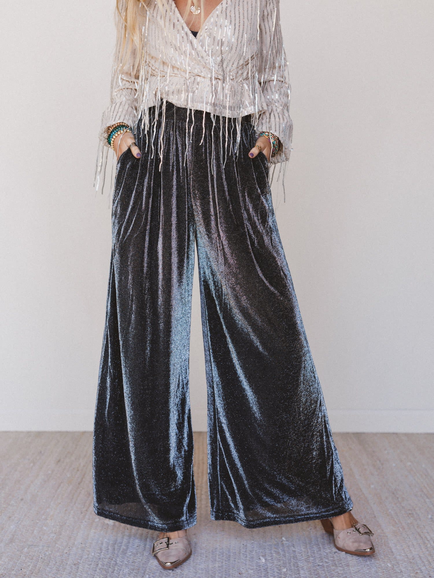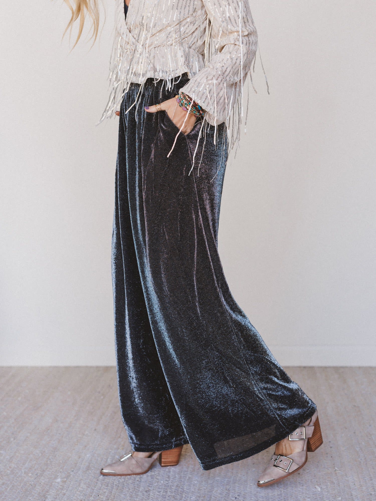 Float through your day in the Songbird Sky Pants—velvety soft with a shimmer that catches the light and a silhouette that flows like poetry. These wide-leg pants are an instant statement piece that brings glam boho energy to any outfit, from casual brunches to moonlit gatherings.