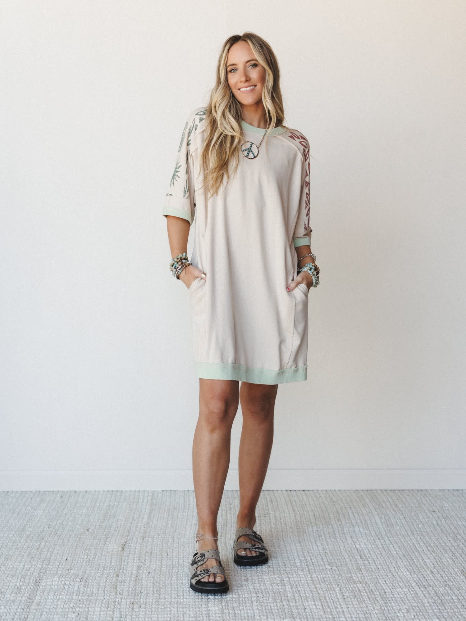 Perfect for your next beach vacation or casual weekend adventure, this relaxed tee dress captures that effortless boho chic vibe you've been searching for. The soft shell print adds a touch of coastal charm to this versatile bohemian fashion staple.