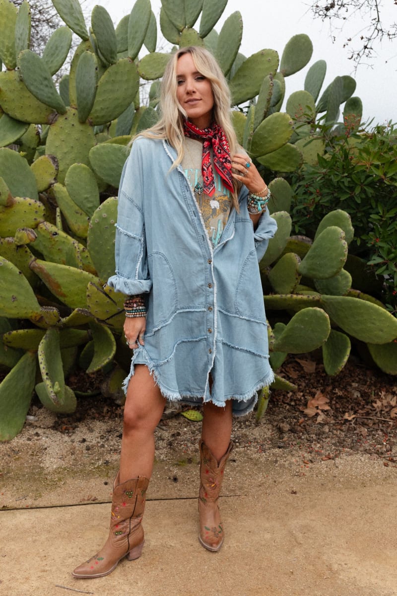 • Ophelia Oversized Denim Dress: Wear it open like a duster or buttoned up as a shirt dress—this piece does it all with its raw hemline, relaxed silhouette, and lived-in chambray texture.