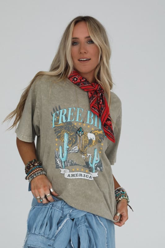 • Fly Free Graphic Tee: A washed vintage olive tee featuring a soaring eagle, desert cacti, and "Free Bird" lettering—this one's a go-to for effortless cool.