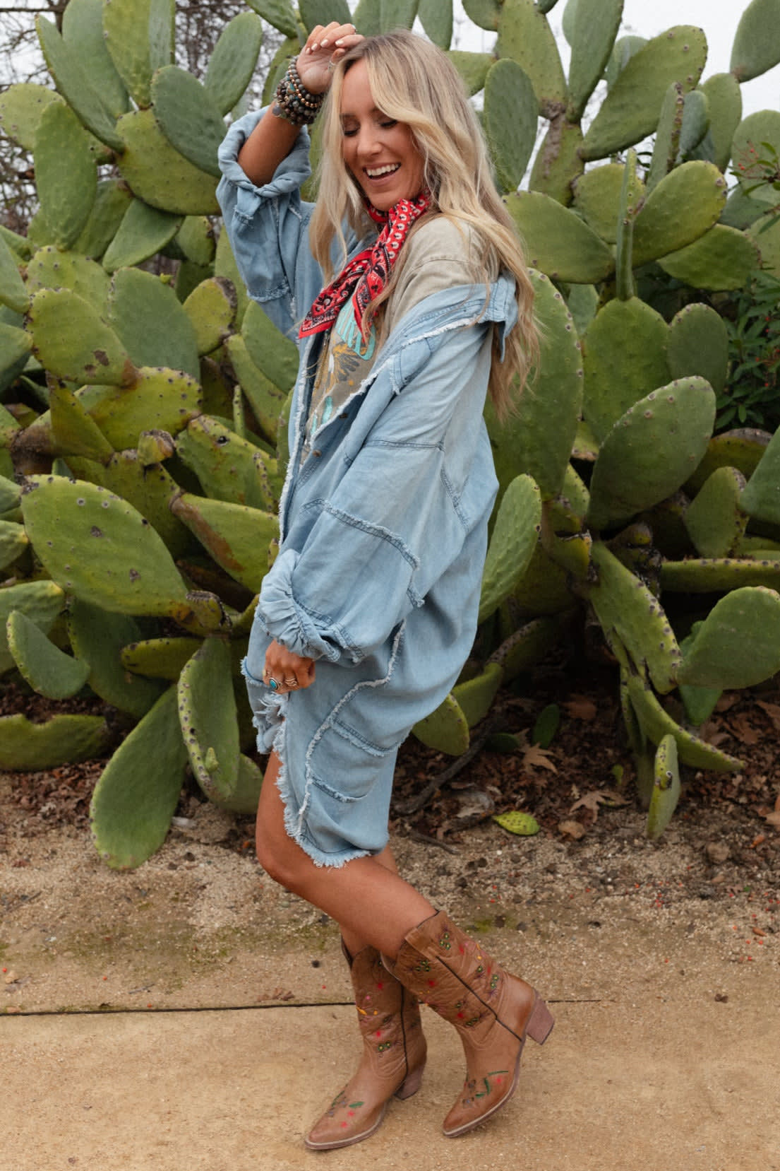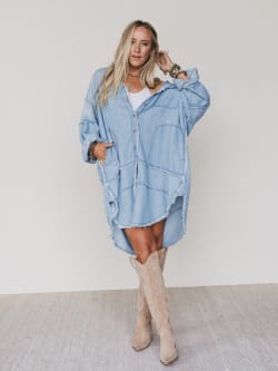 • Ophelia Oversized Denim Dress: Wear it open like a duster or buttoned up as a shirt dress—this piece does it all with its raw hemline, relaxed silhouette, and lived-in chambray texture.
