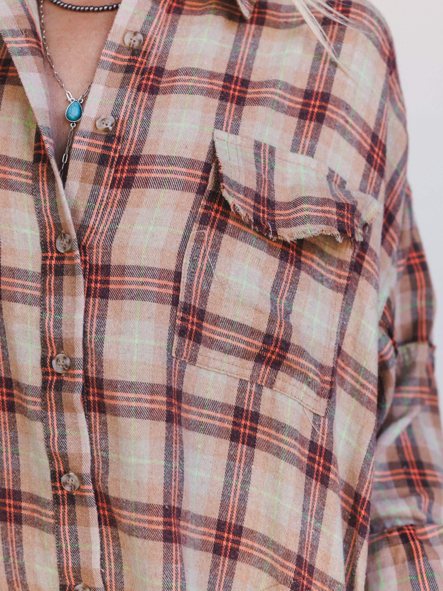- Distressed plaid print with raw hem for that perfectly lived-in vibe