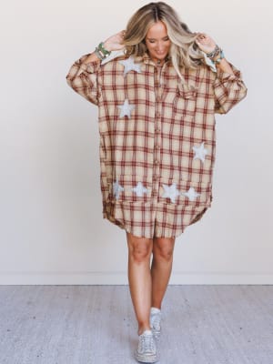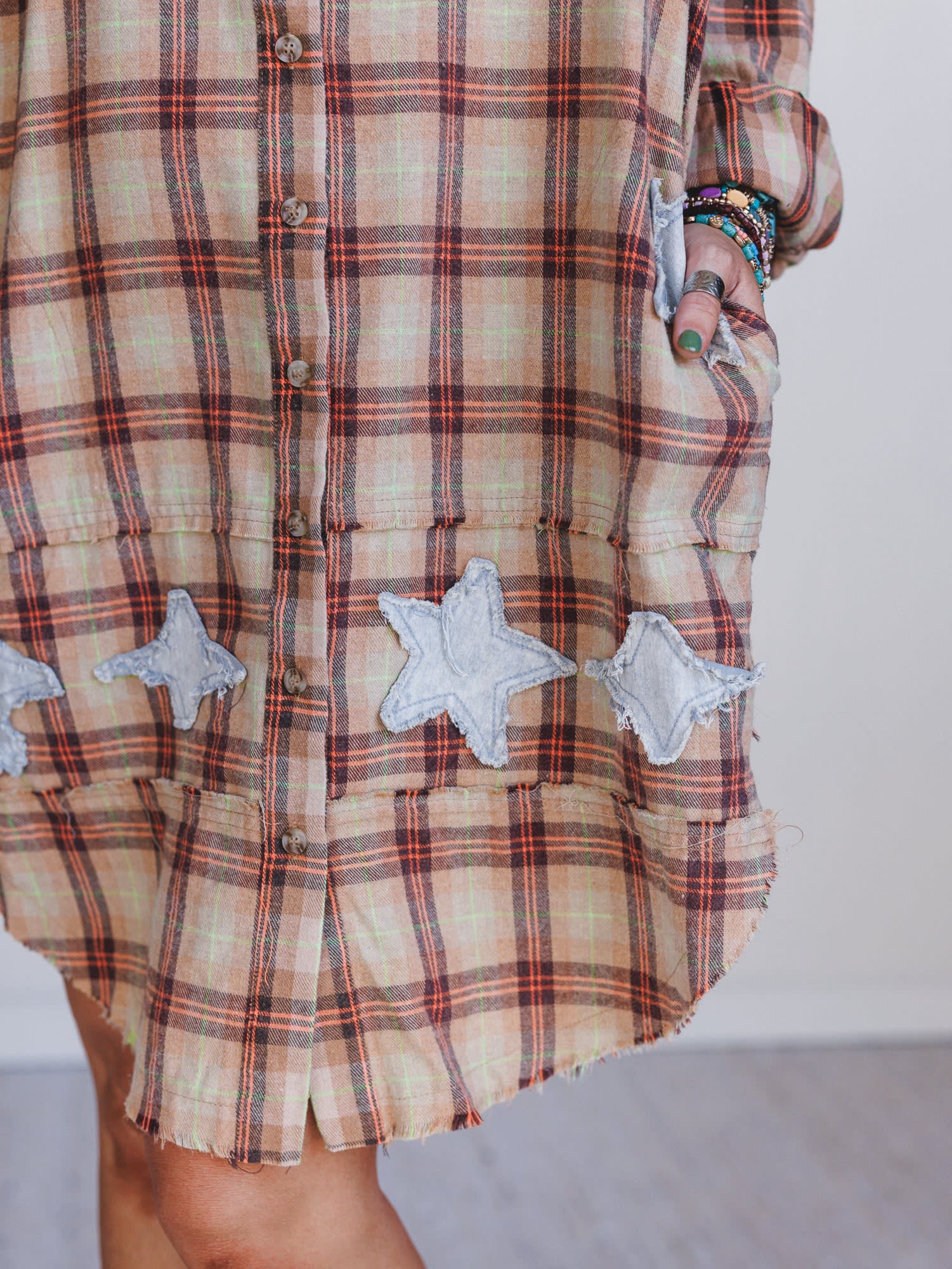 Bring a little stardust to your everyday with the Southern Twilight Button Down Dress. This vintage-inspired plaid beauty blends rustic charm with celestial flair, making it your go-to piece for road trips, festivals, and spontaneous coffee runs.