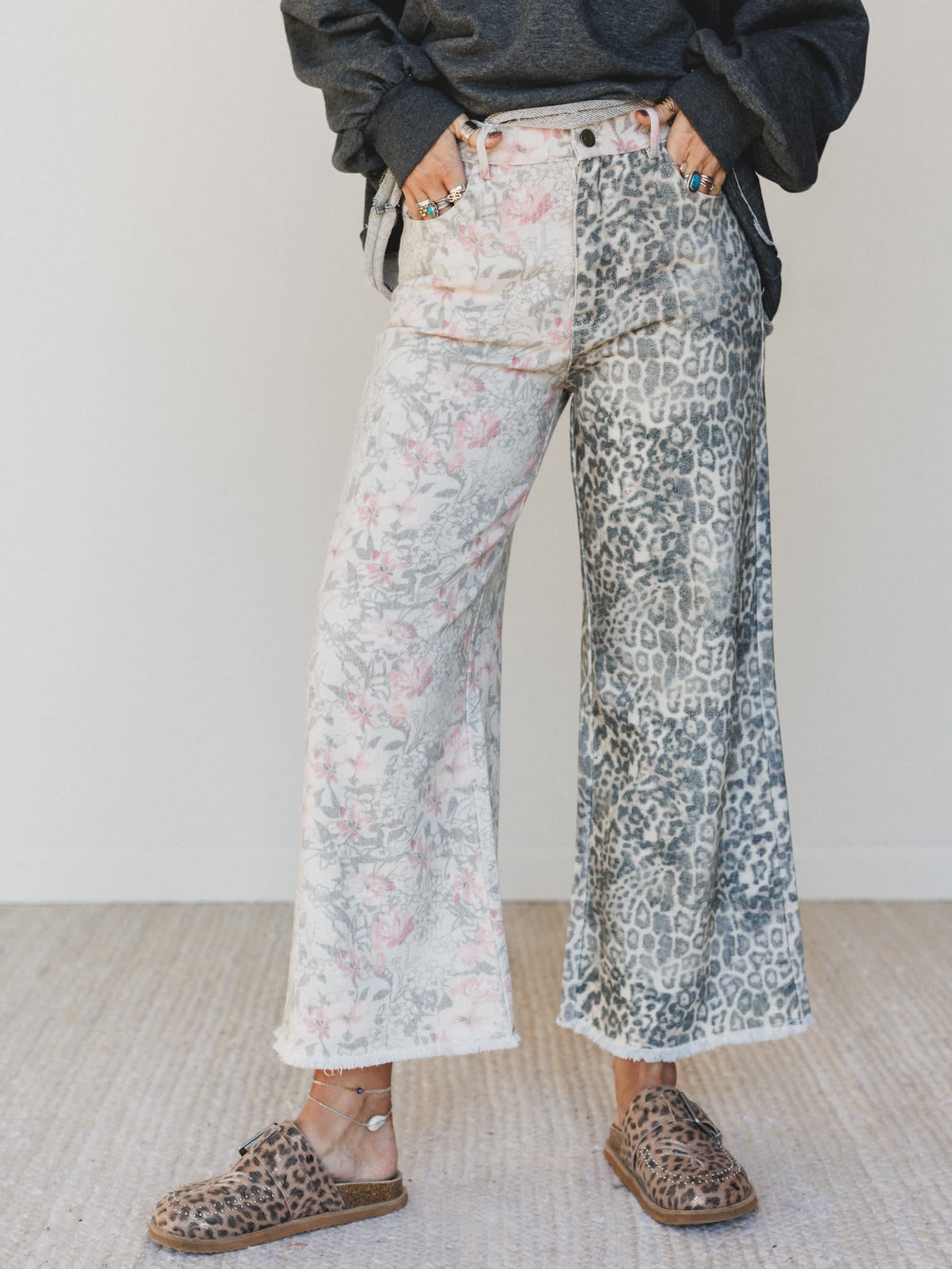 • The Nest Ezra Mixed Print Wide Leg Jeans: Equal parts floral and fierce, these soft denim pants blend vintage florals with bold leopard print in a split-leg design. Cropped wide-leg cut and raw hems bring the perfect amount of edge.