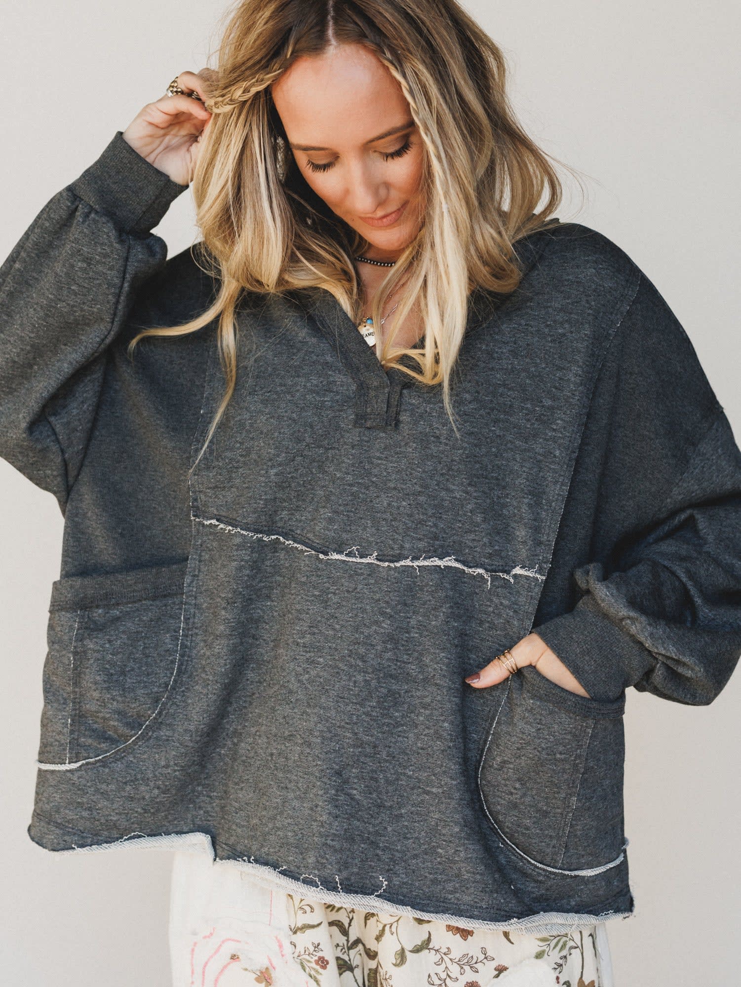 • The Nest Karli Knit Pocket Top: A charcoal pullover with exposed seam stitching, curved front pockets, and a comfy oversized fit. Raw-edge details give it that lived-in, layered-up vibe.
