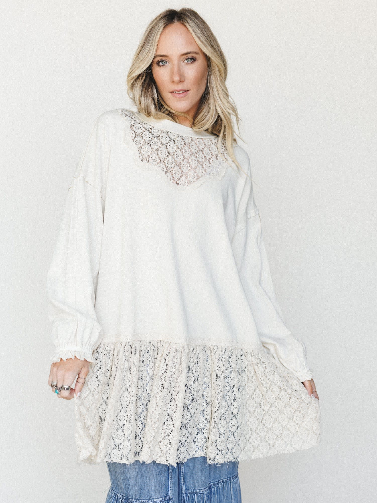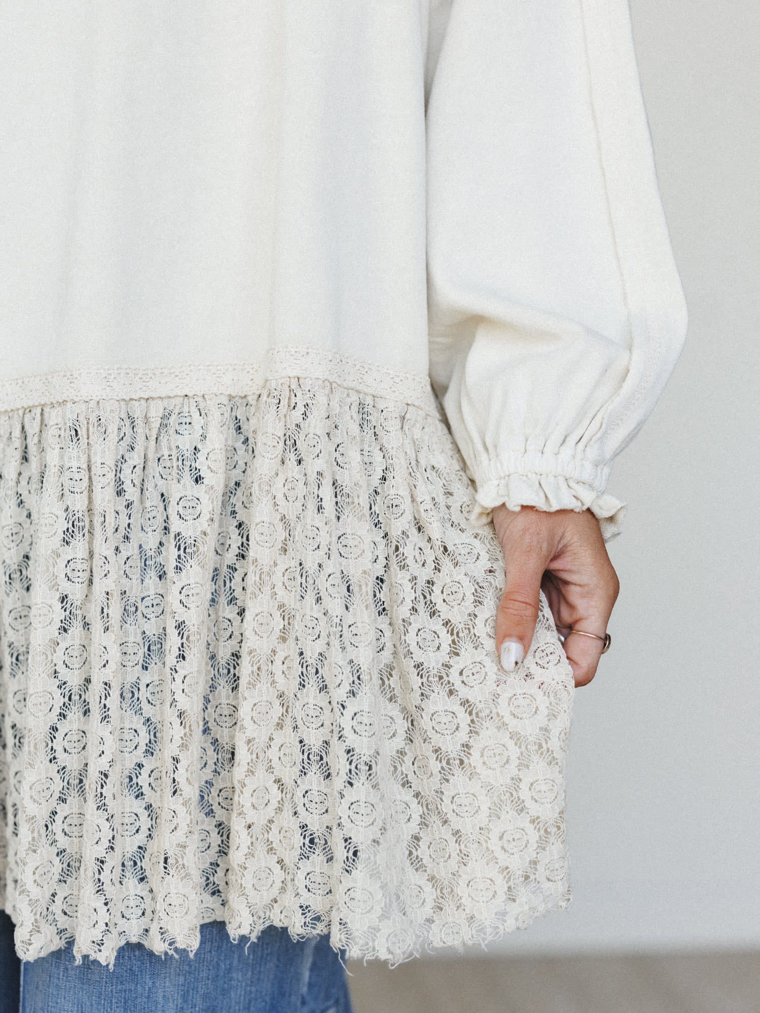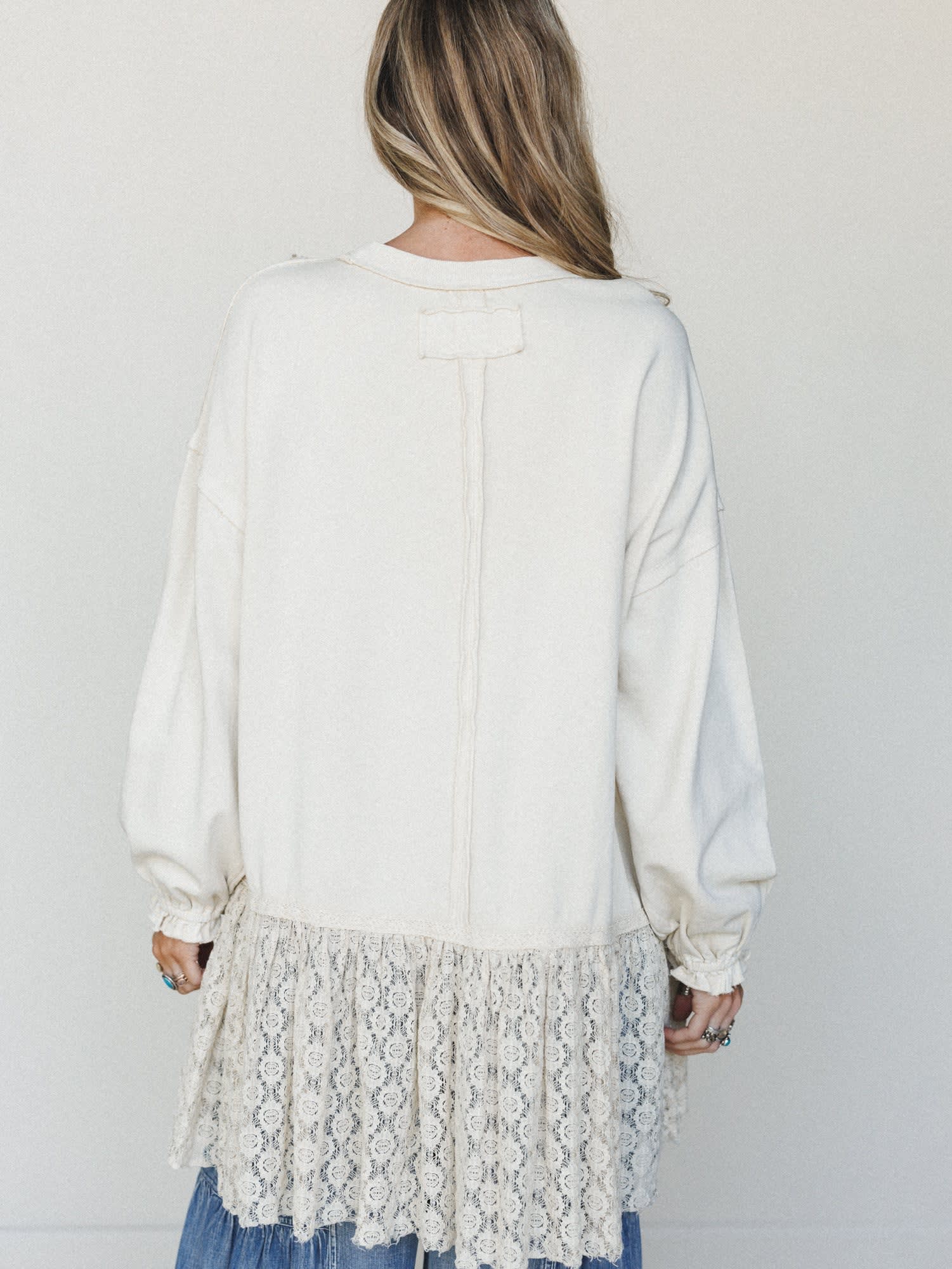 - Oversized cream French terry sweatshirt with a sheer floral lace yoke panel at the chest and a full gathered lace ruffle hem that runs all the way around — front and back.