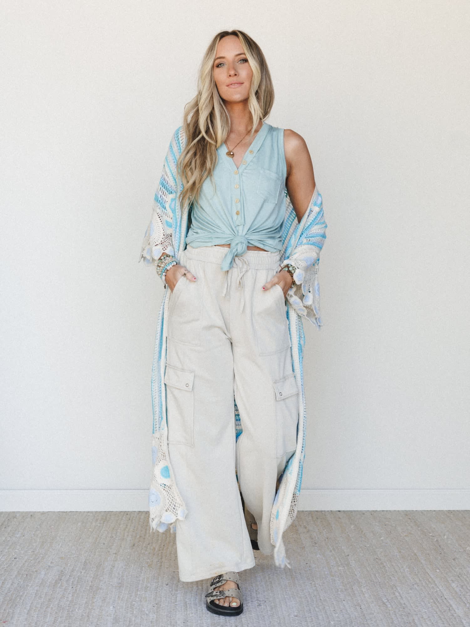 - Features a soft henley tank, flowy wide leg pants, and an open-front duster with geometric patchwork detailing and delicate lace trim.