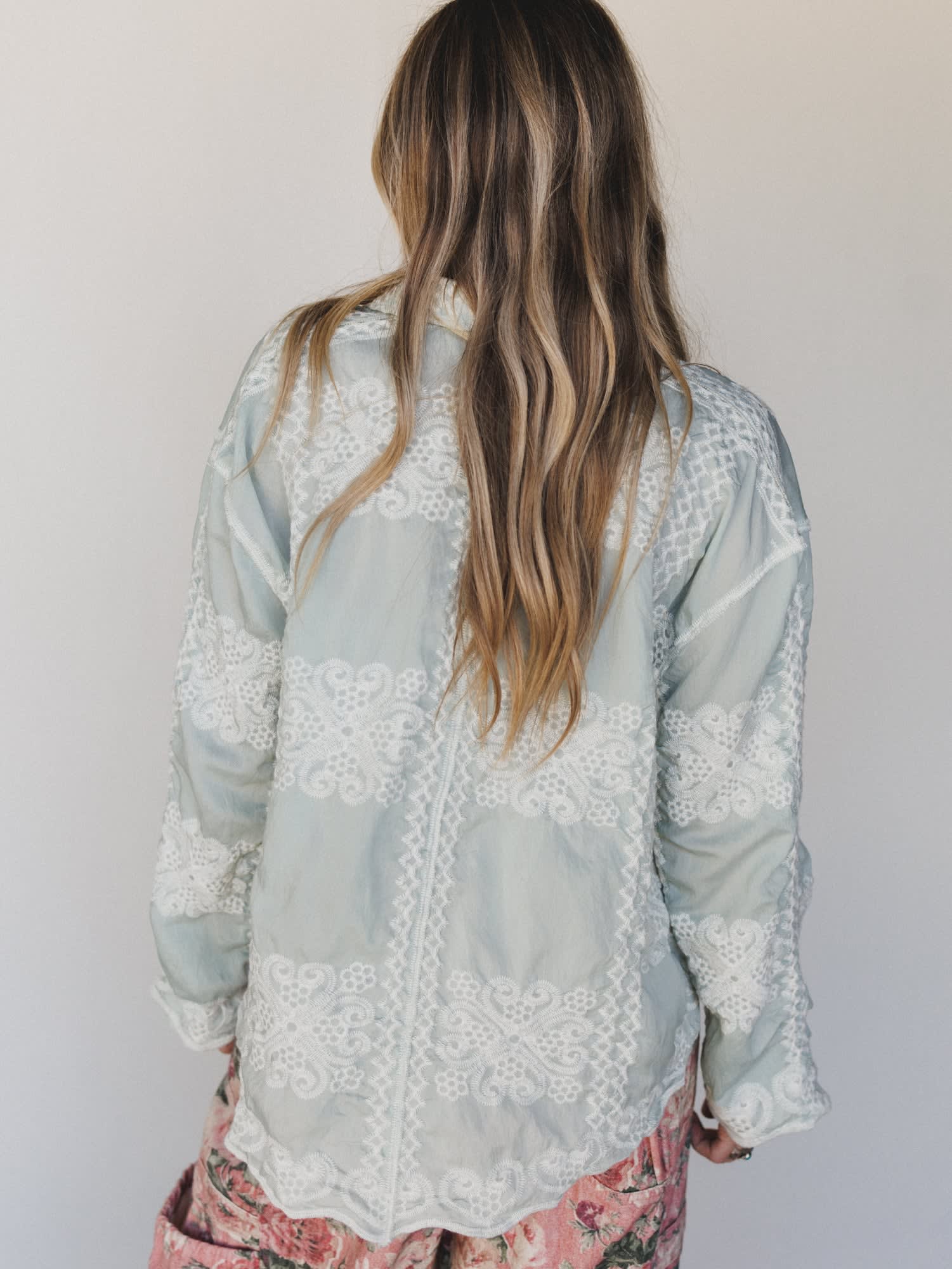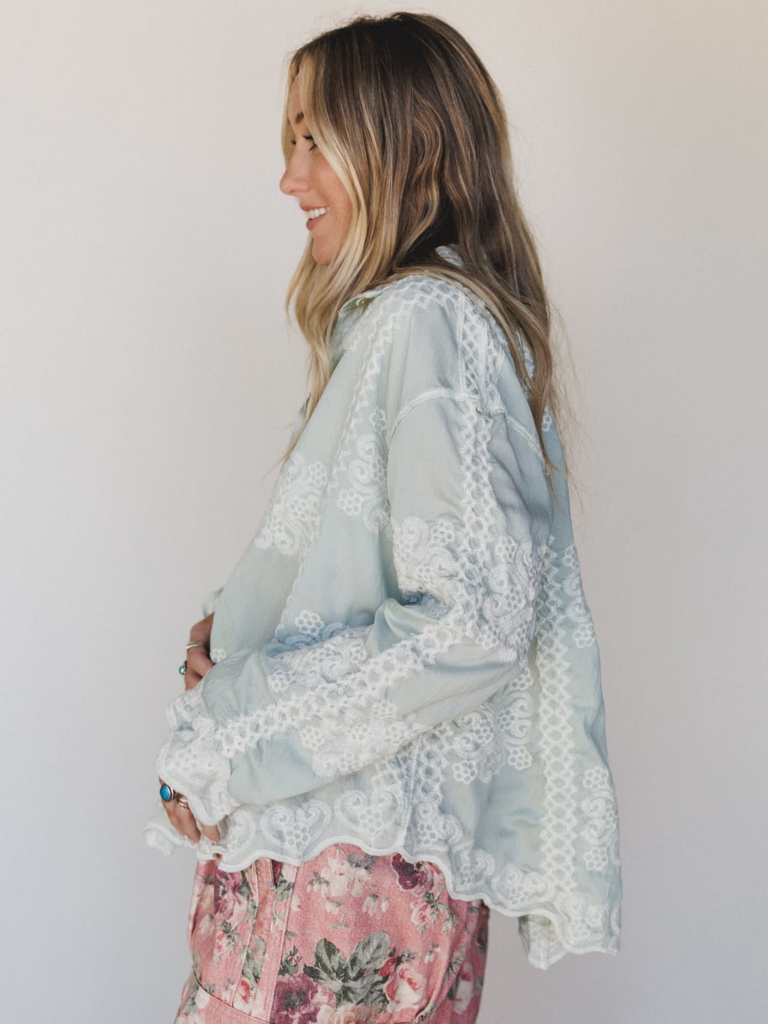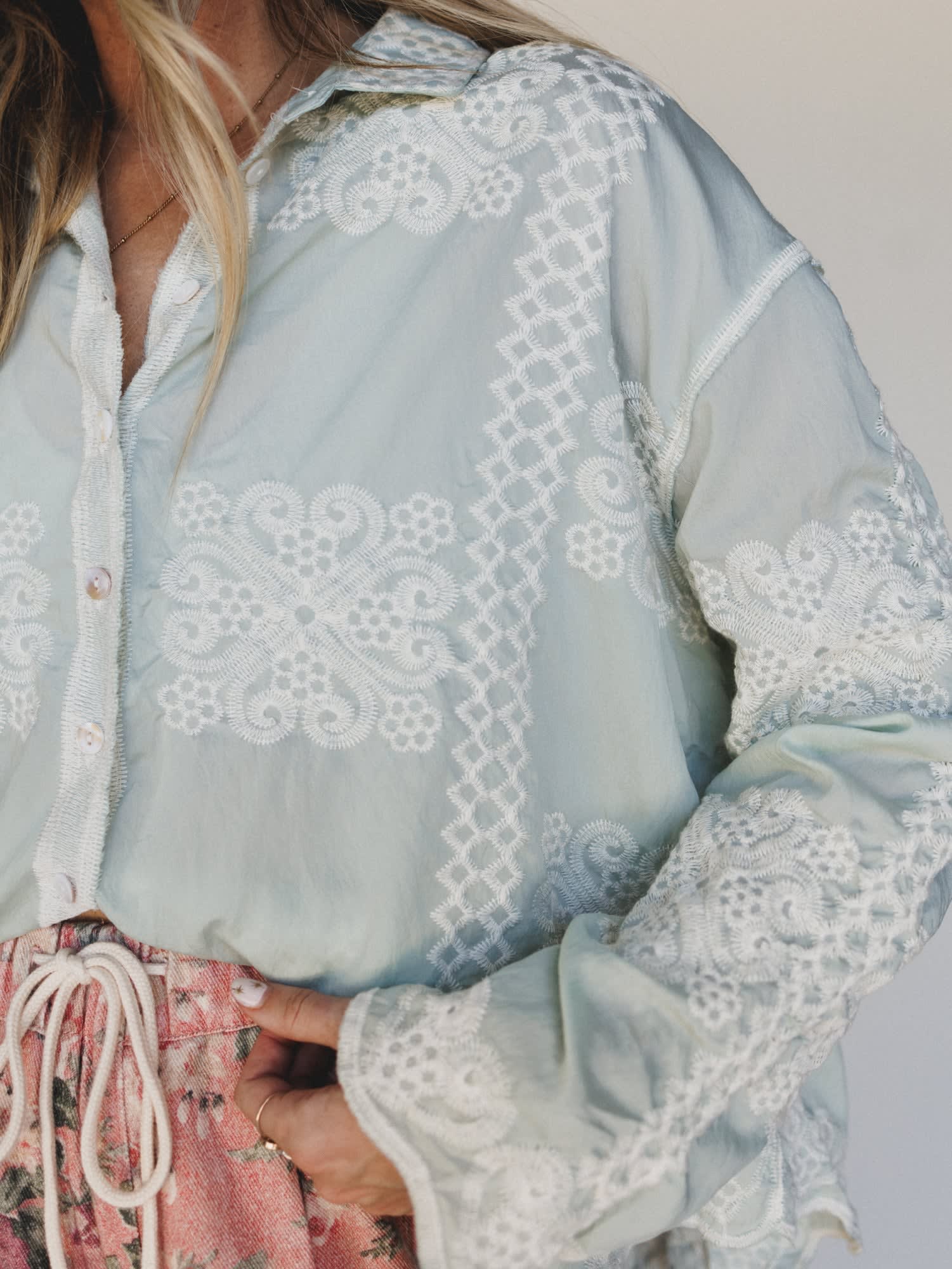 Wondering what to wear to a spring brunch, a garden party, or honestly any occasion where you want to look effortlessly put-together? This dreamy lace-embroidered button down blouse is one of those bohemian blouses that answers every outfit question with a resounding yes.
