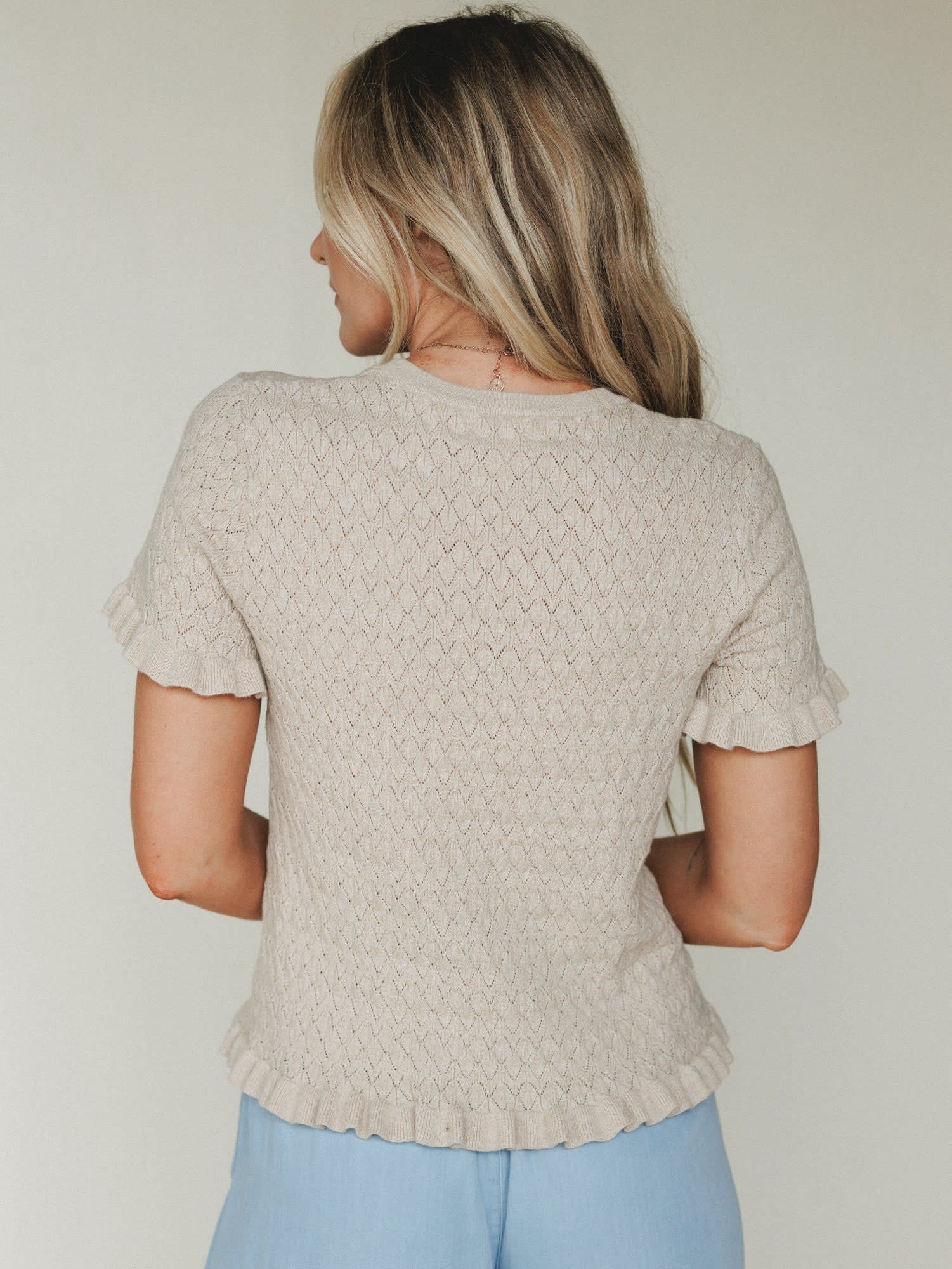 The kind of piece you’ll reach for when you’re putting together an easy everyday boho outfit or deciding what to wear for a casual brunch or weekend outing. With soft knit texture and delicate ruffle details, this top brings a sweet, feminine touch to laid-back styling.