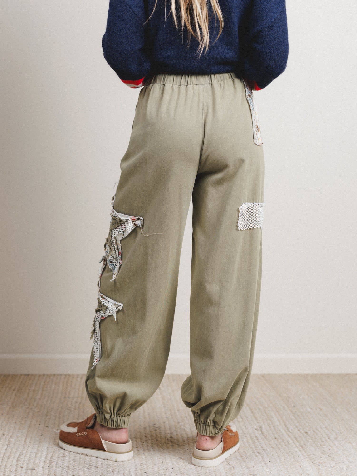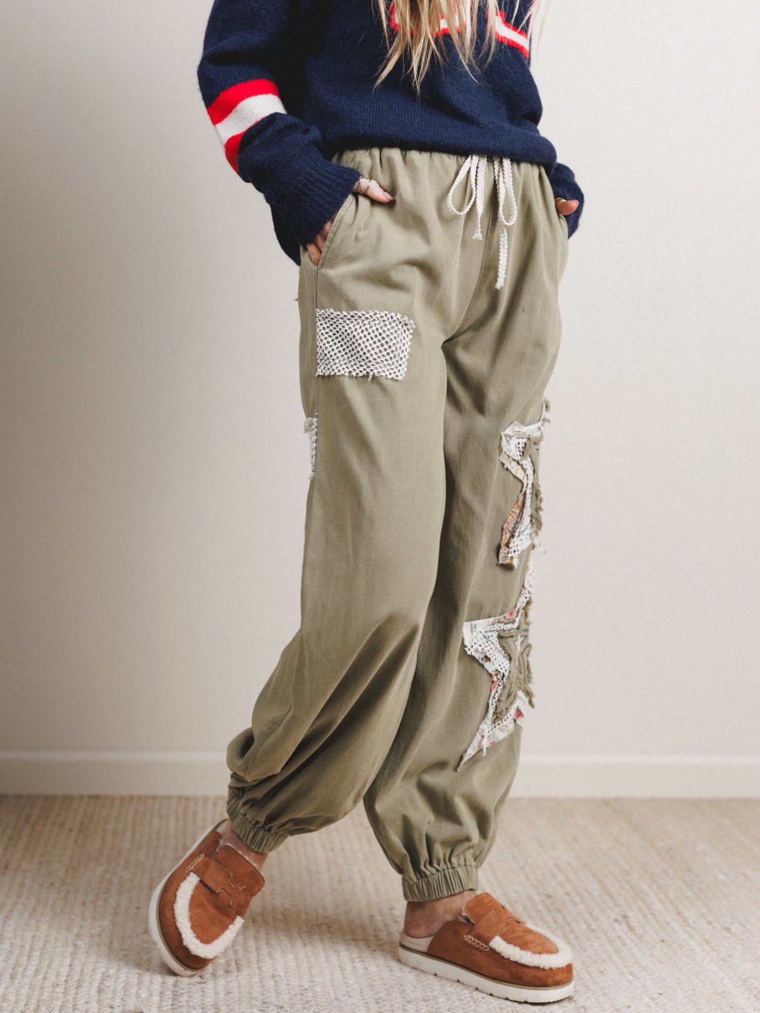 - Olive cotton base with raw-edge crochet star patches and embroidered side panels
