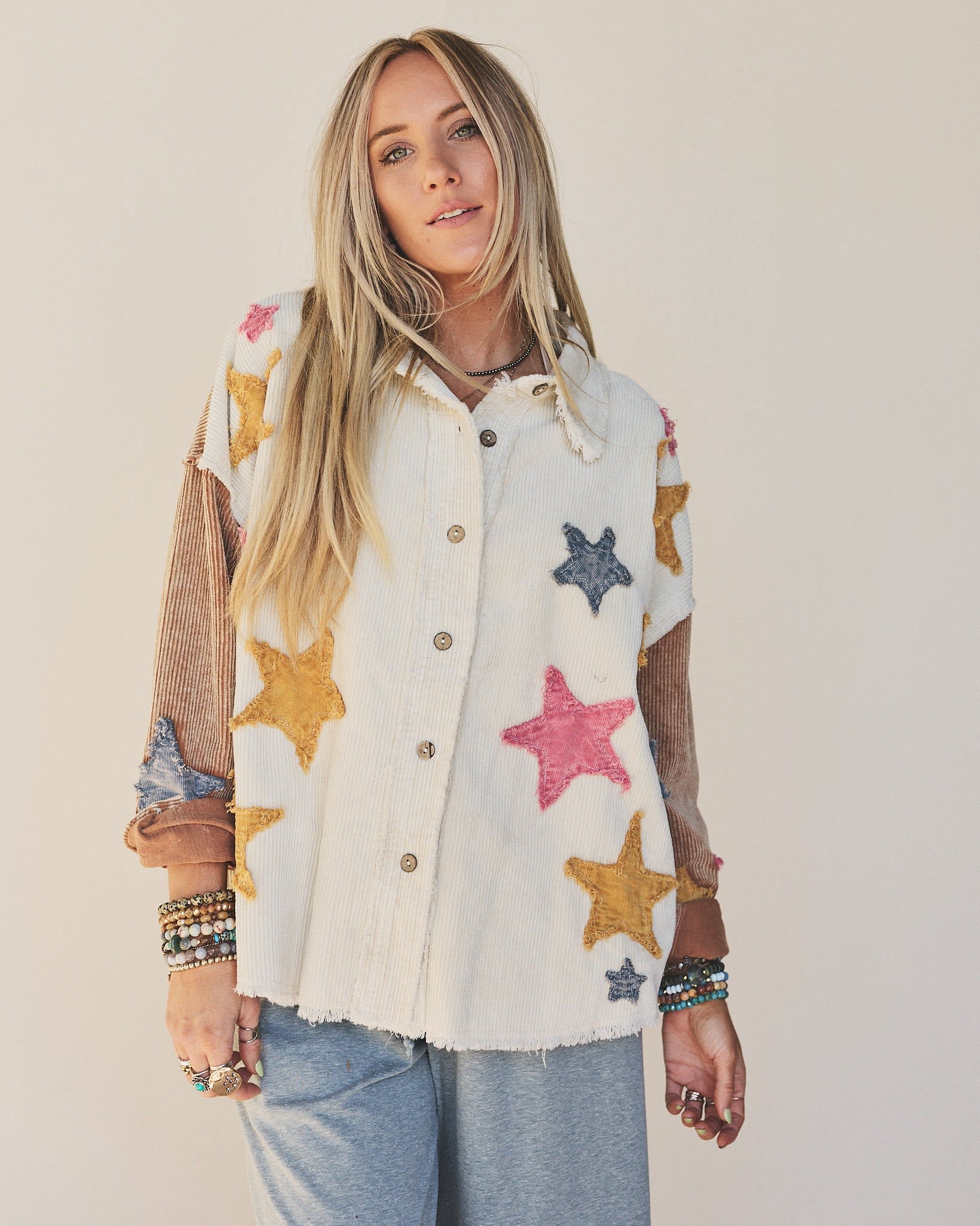 This colorful corduroy shacket is all about playful layers and cozy stargazer vibes—perfect for chilly mornings and starlit nights 🌠