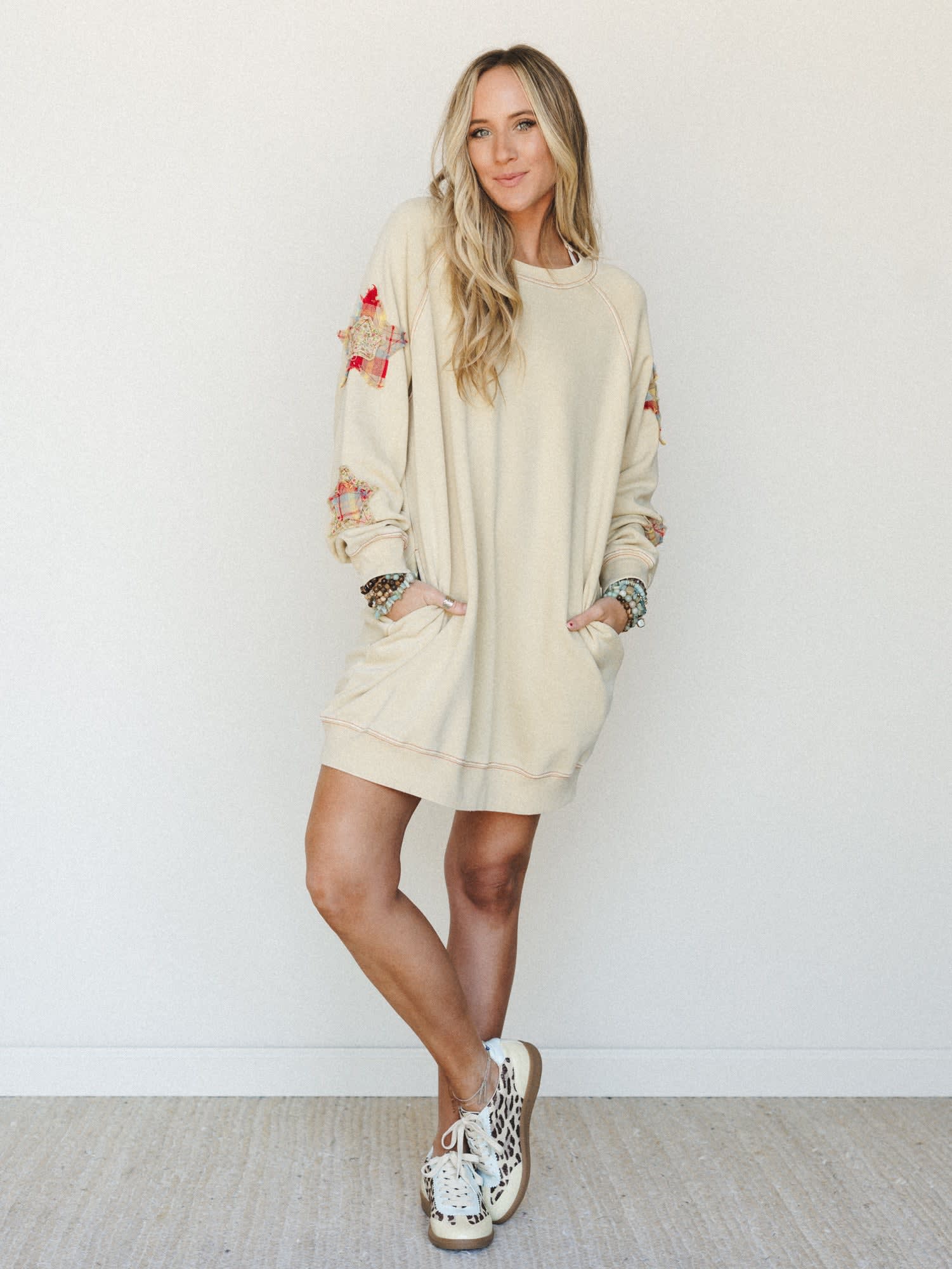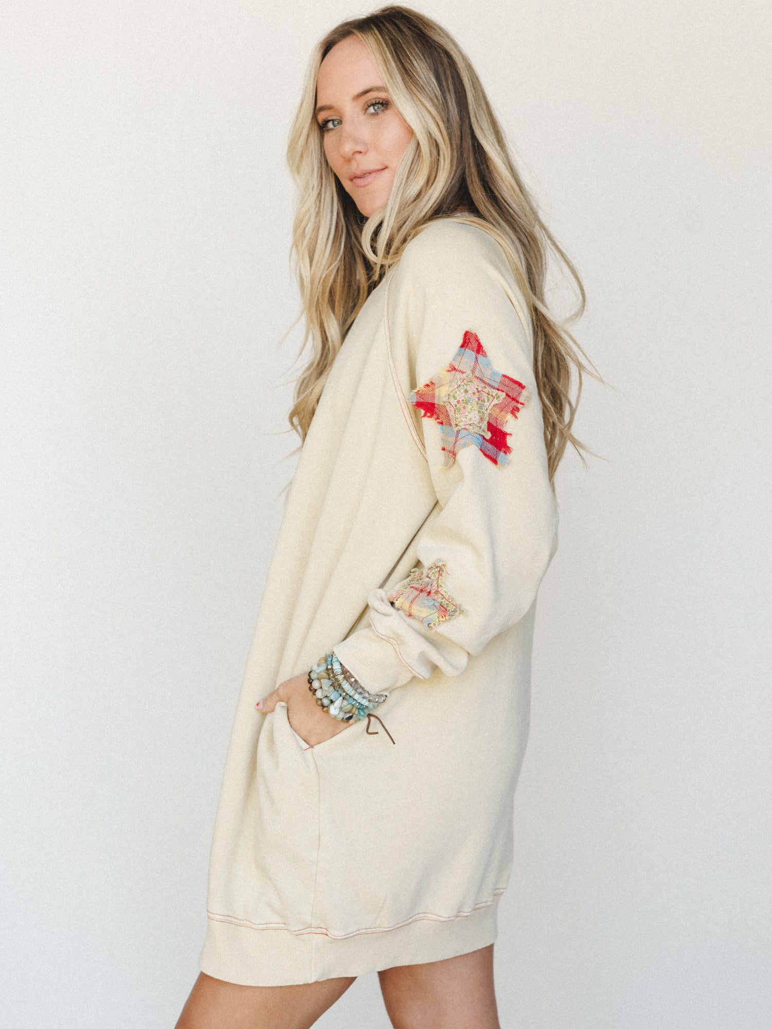 When you're looking for the perfect cozy festival outfit that doubles as your go-to comfort dress, this oversized sweatshirt dress delivers effortless boho chic vibes. The patchwork star details scattered along the sleeves add an artisanal touch that embodies free-spirited style.