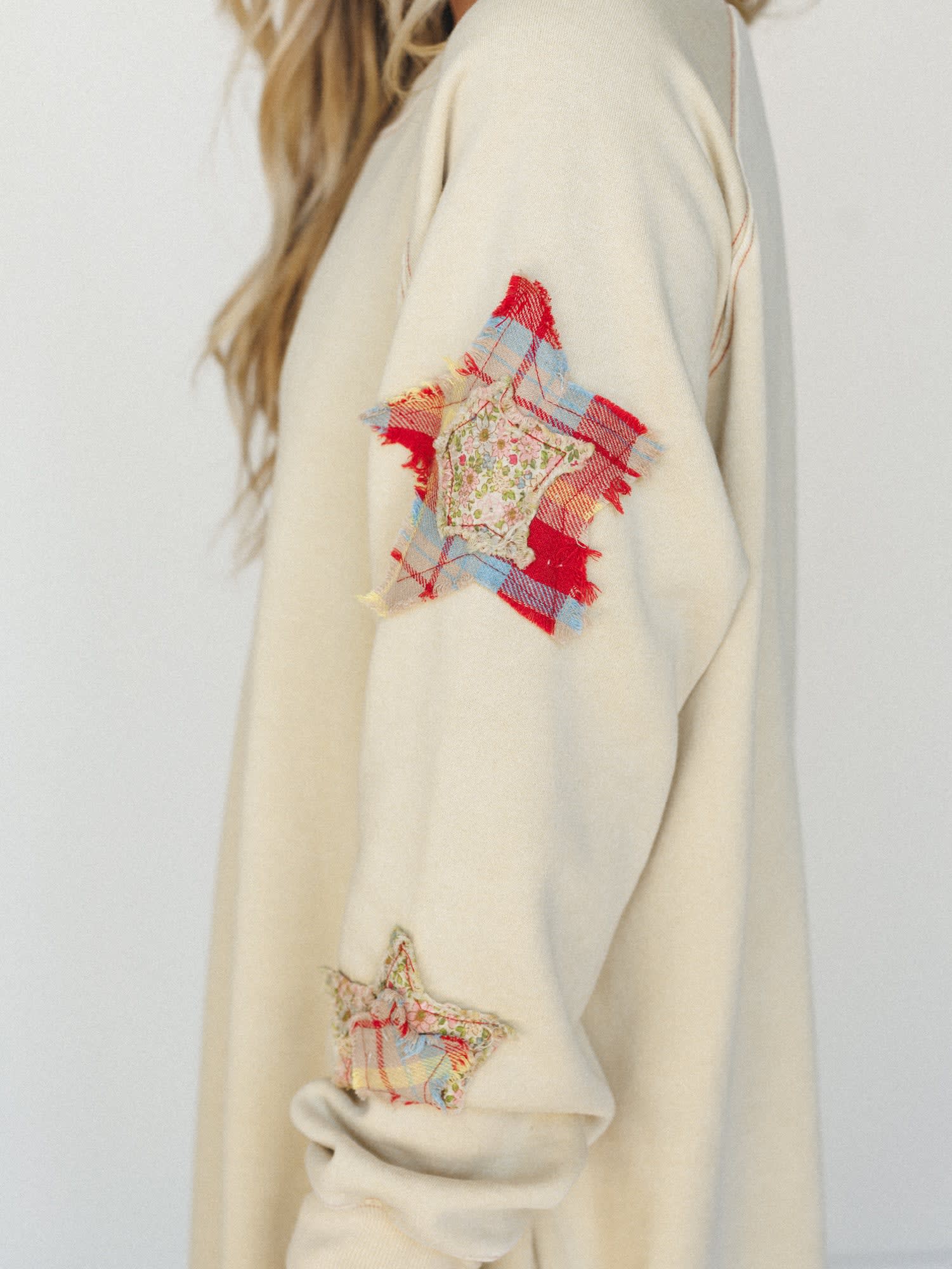 - Patchwork star appliques along the sleeves bring unique bohemian fashion detail to this versatile piece.