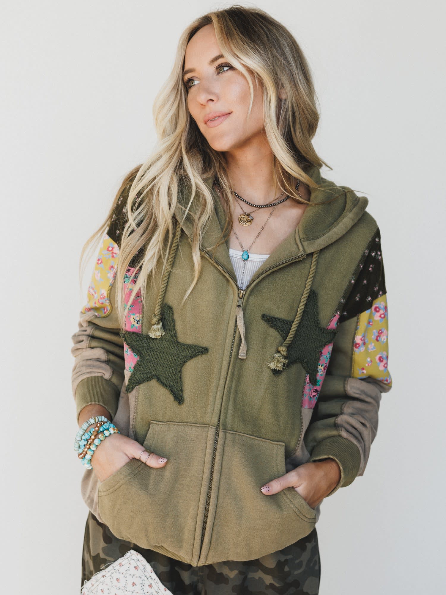 • Dark olive textured star patches on the front for a subtle western-inspired vibe