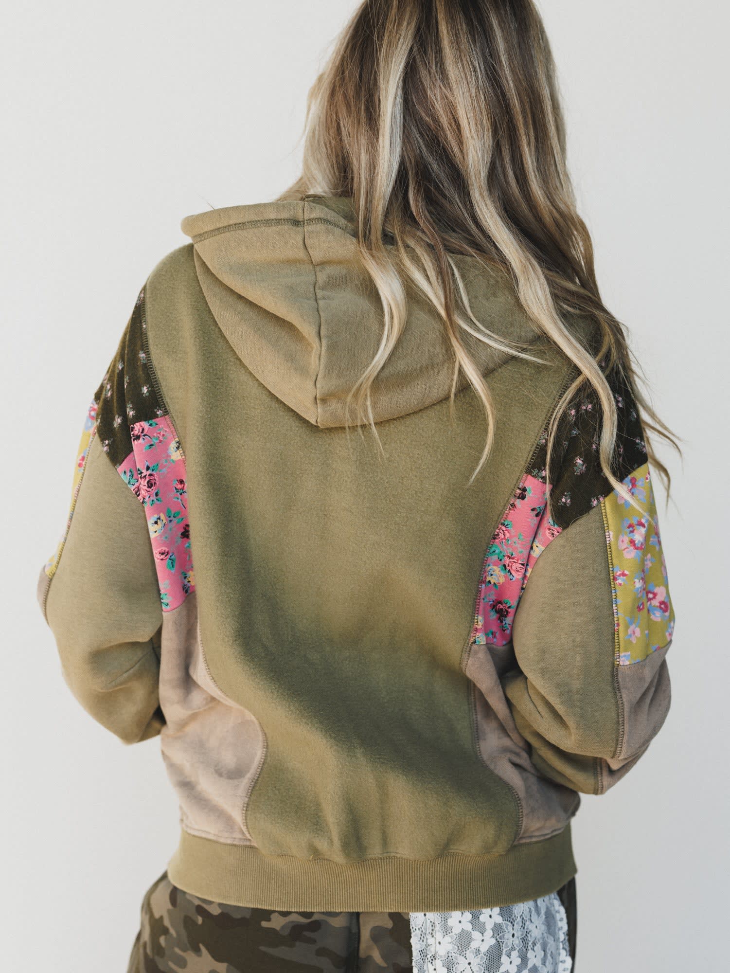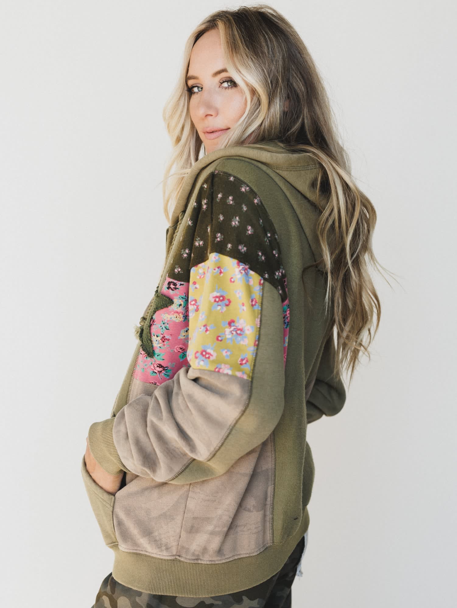 • Mixed floral patchwork sleeves in pink, mustard, and deep olive tones