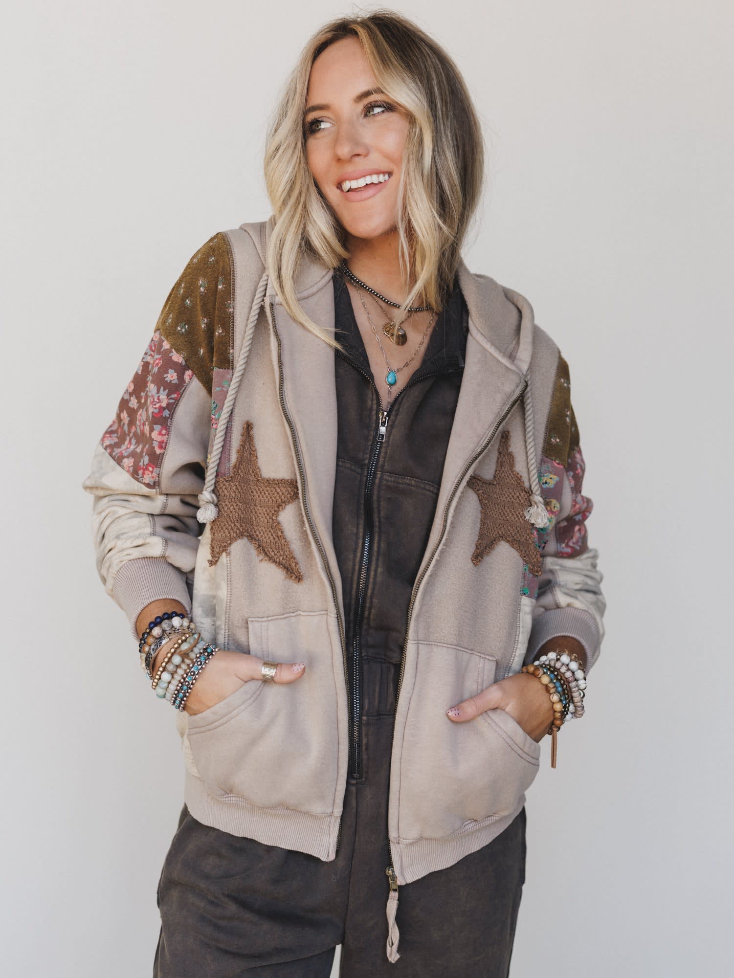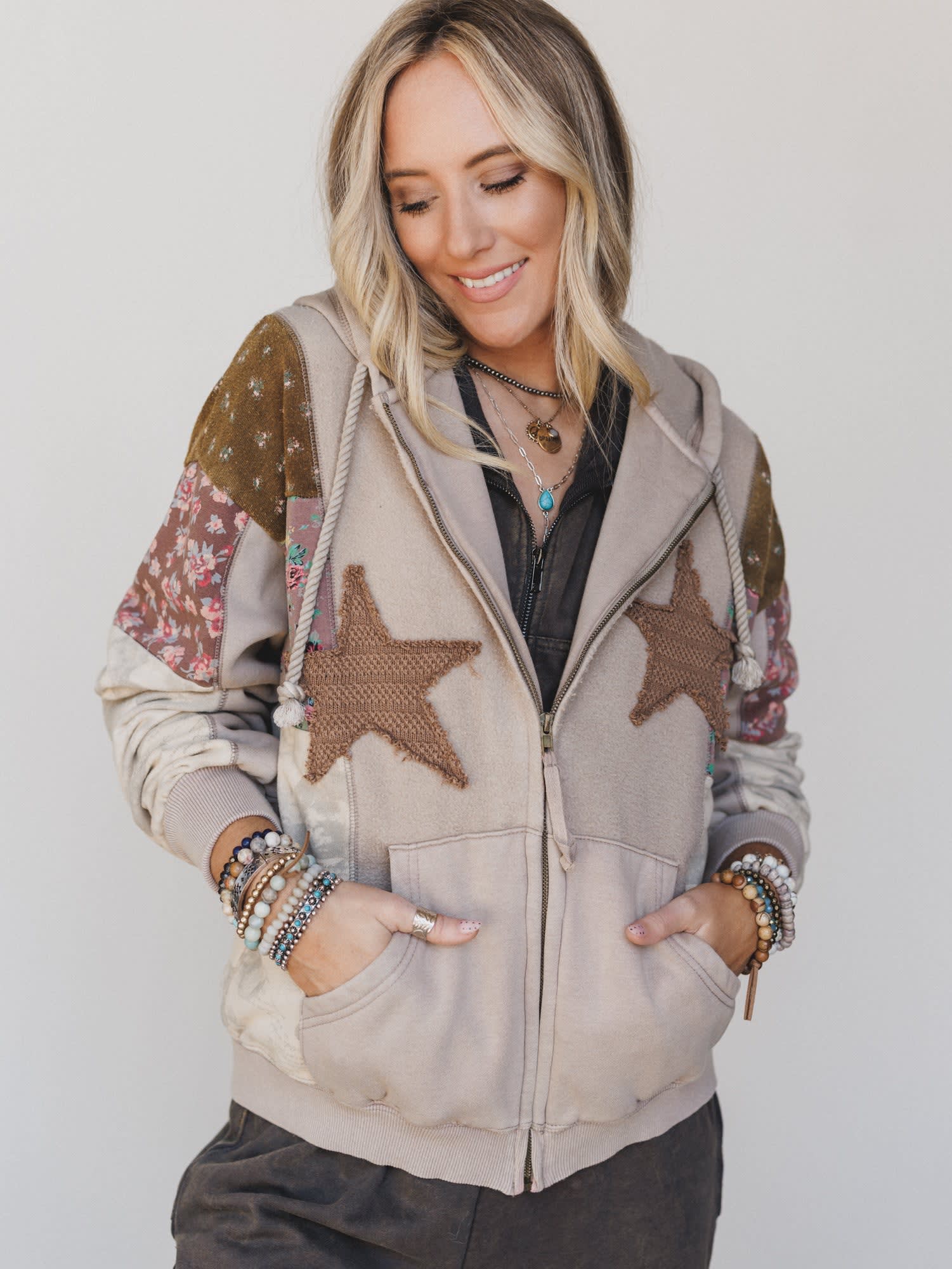 - Dark brown textured star patches on the front for a subtle western-inspired vibe