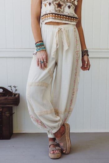 Wear this adorable lace crochet top with bell bottom jeans and booties.