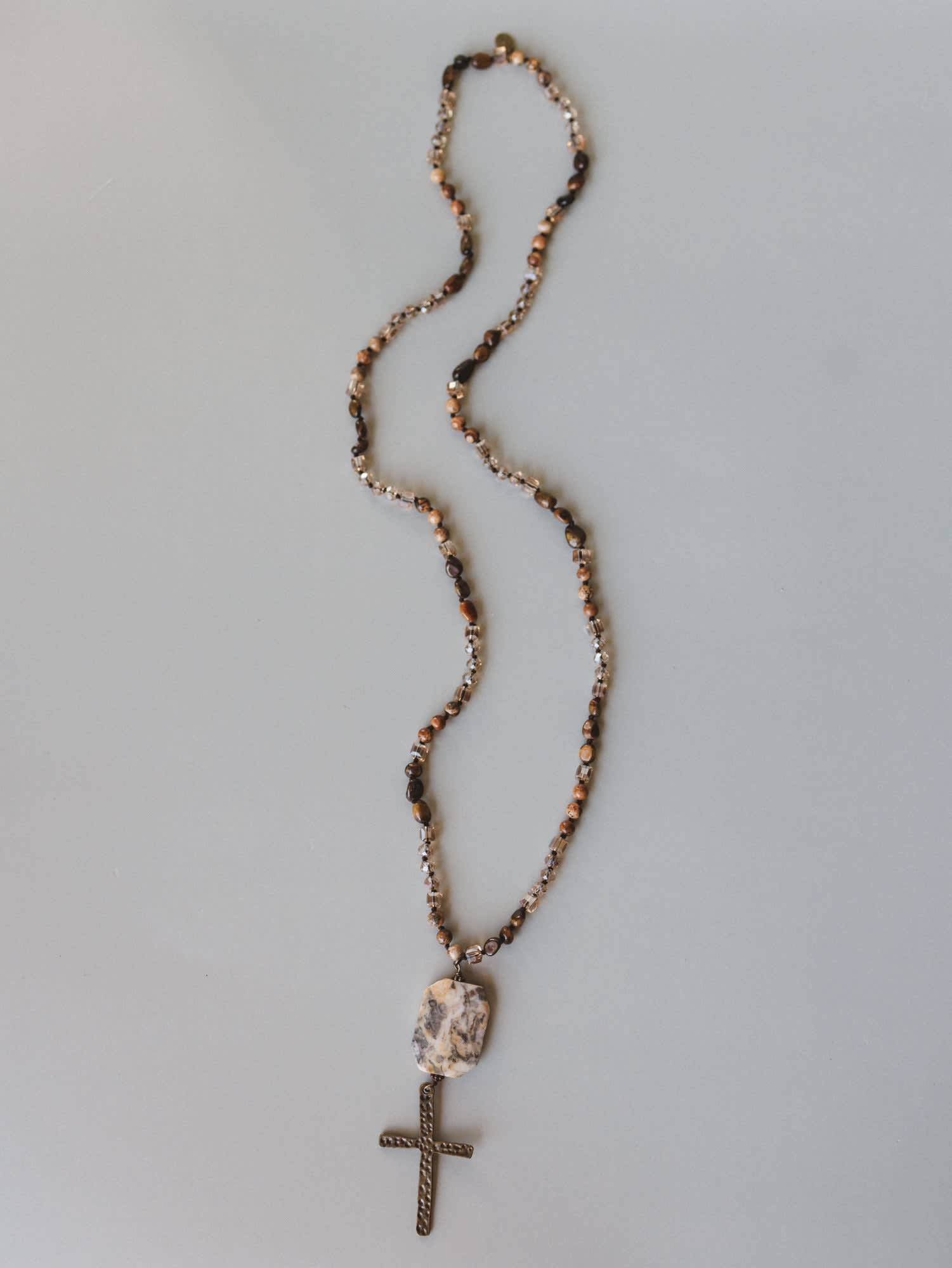 Earthy elegance meets meaningful detail in the Stephanie Necklace. Featuring a mix of warm-toned beads, shimmering accents, and a natural stone centerpiece, this long necklace is finished with a textured cross pendant for a look that’s both grounded and beautiful.