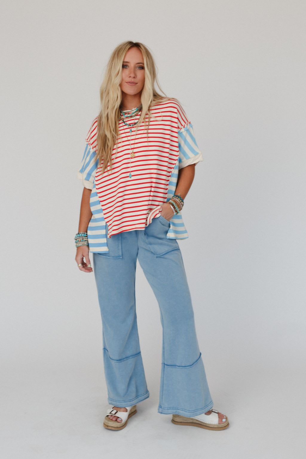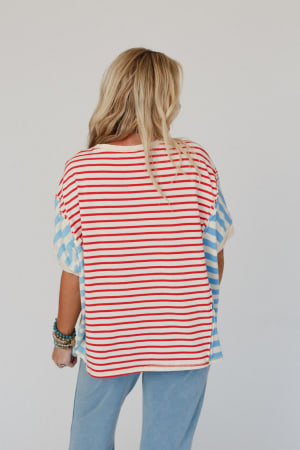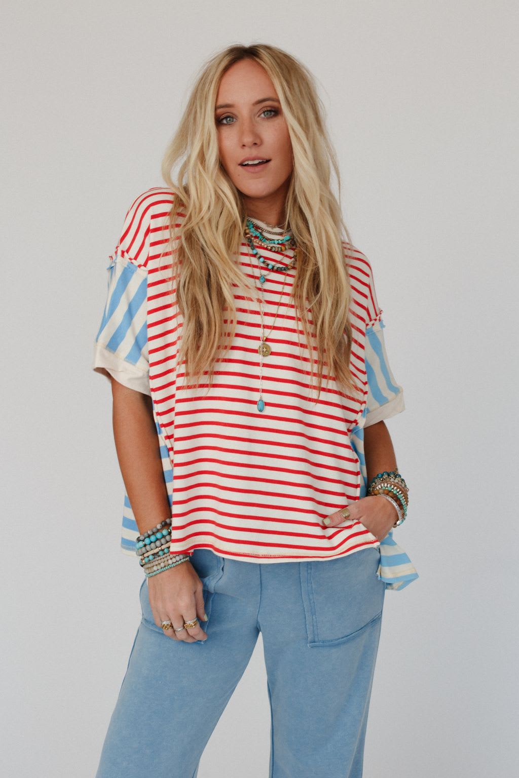 With such a perfect boho silhouette, the Street Sleek High Low Top is the perfect addition to your boho bottoms with a colorful striped pattern to express your unique style!