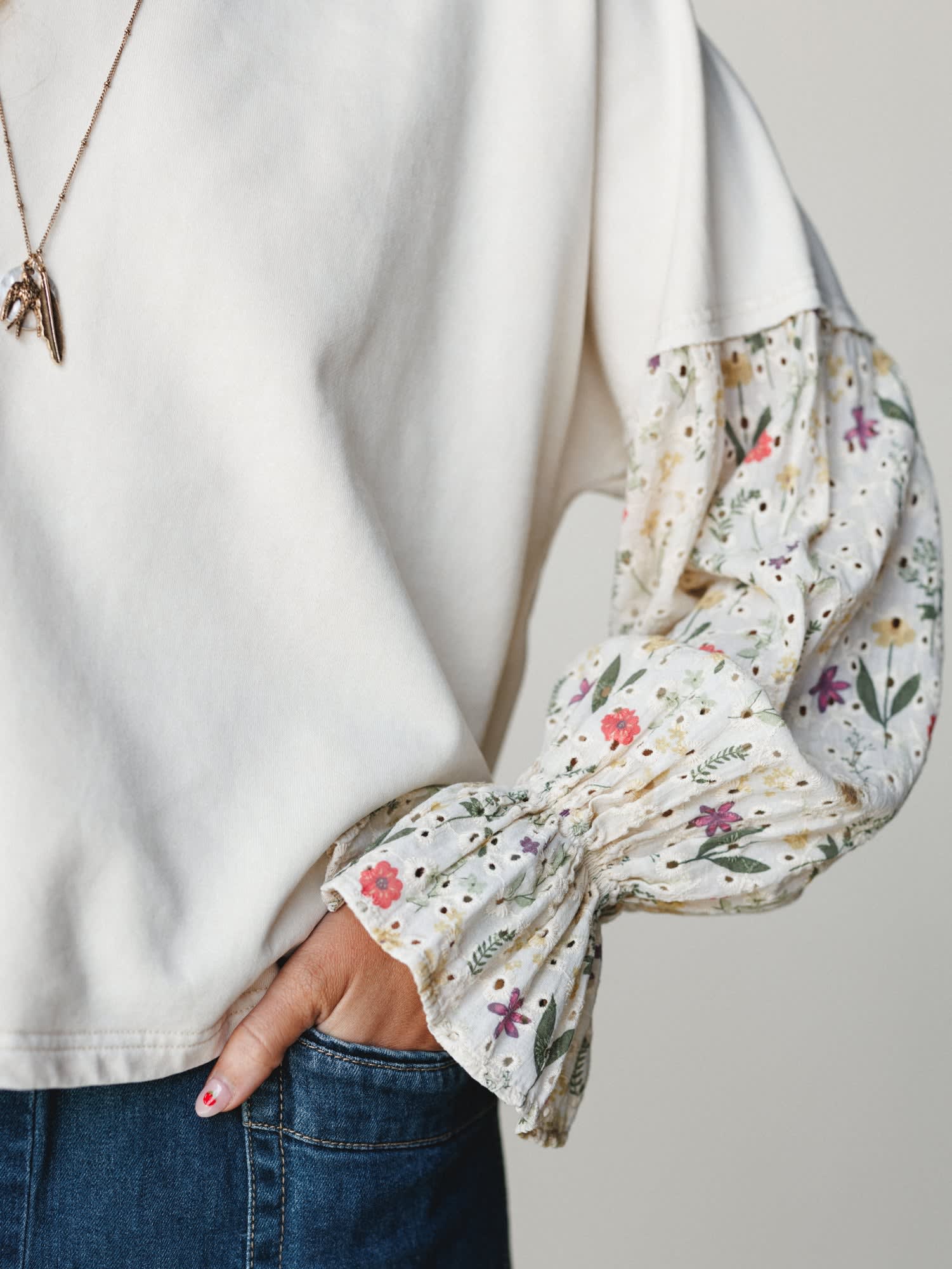 • Statement floral sleeves with elastic cuffs add romantic bohemian flair to this versatile boho top.