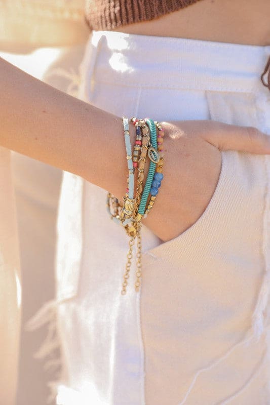 Stacked with colorful cuteness! This multi-colored and multi-beaded bracelet stack features trendy boho beads and charms on a stretchy band for a cool boho-babe look!