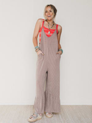 - The Nest Sunday Favorite Jumpsuit in warm taupe ribbed fabric with relaxed wide leg fit, adjustable straps, side pockets, and feminine ruffle hem