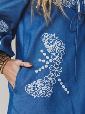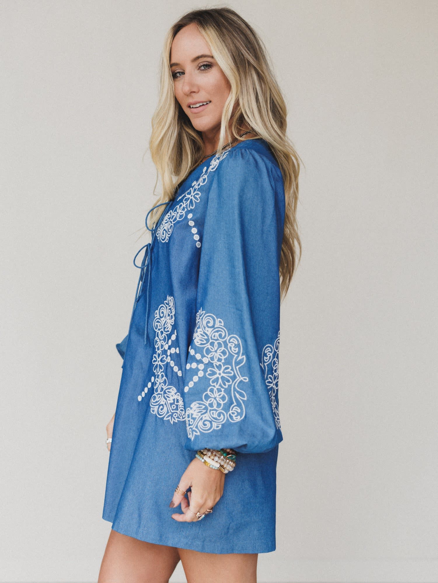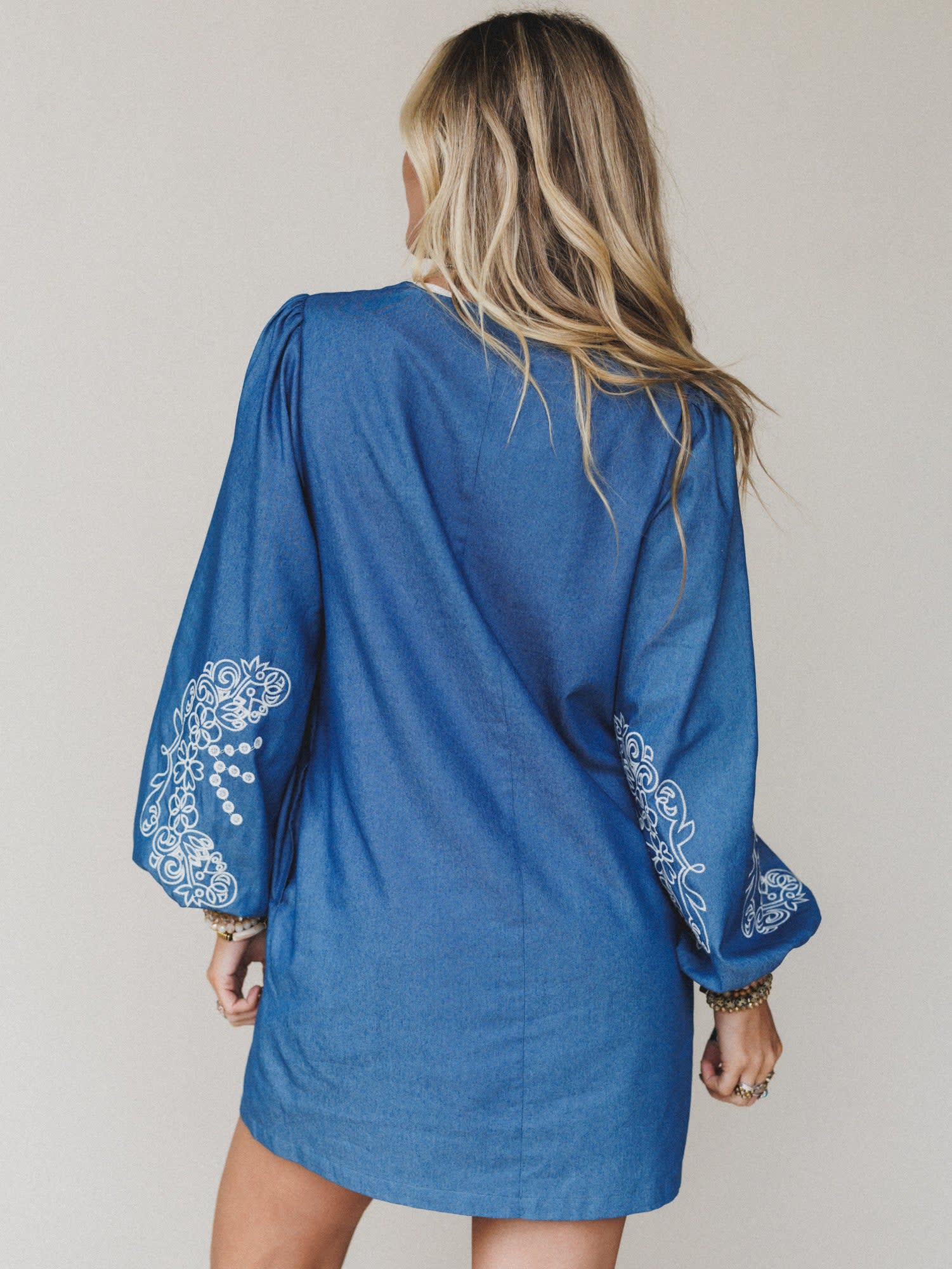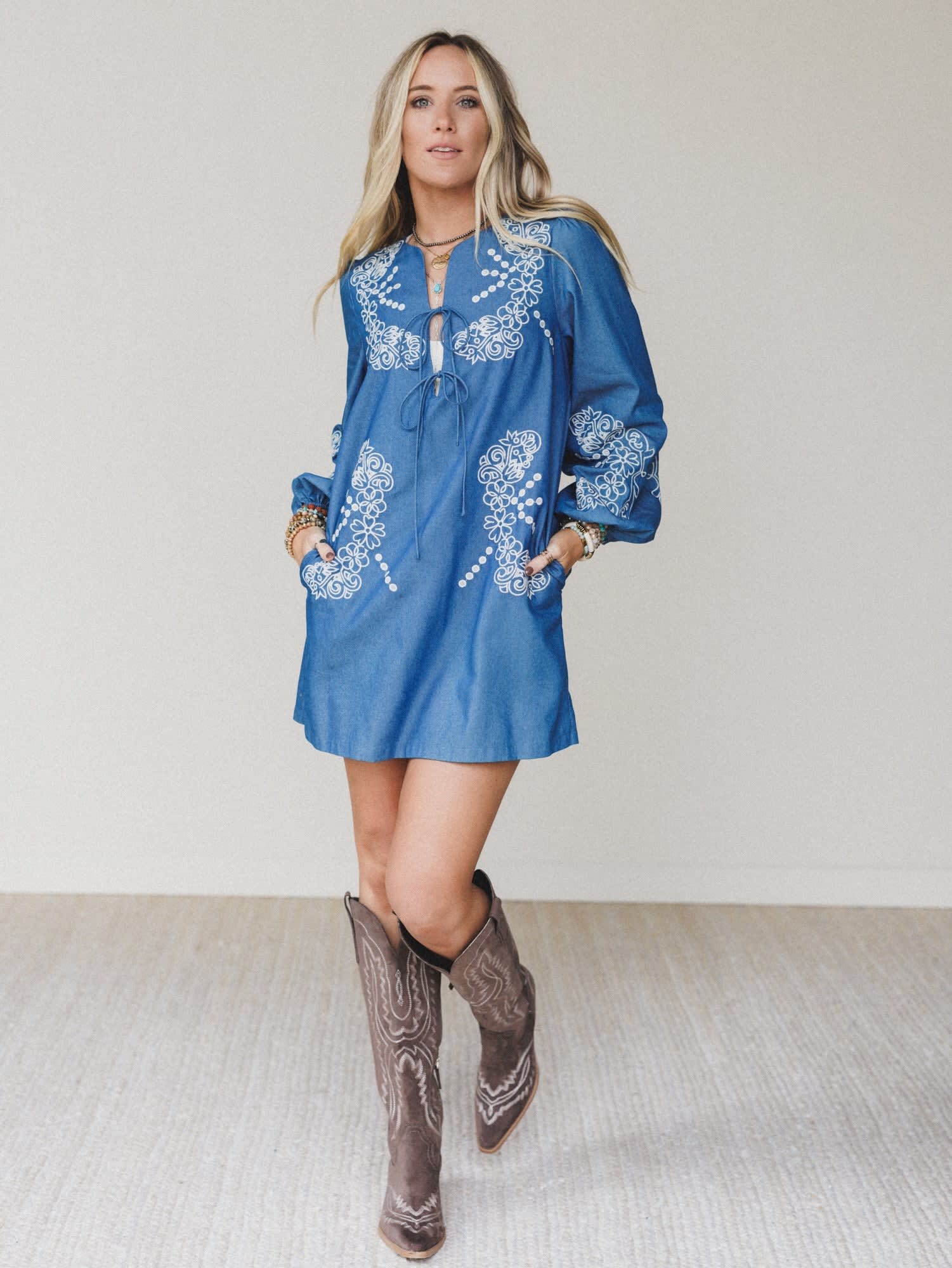 Sweetly boho with a hint of western charm, the Sunday Flow Embroidered Denim Dress is your weekend-ready go-to. With flowy sleeves, soft chambray, and vintage-inspired embroidery, it’s made for market strolls, sunny brunches, or catching golden hour on the porch.