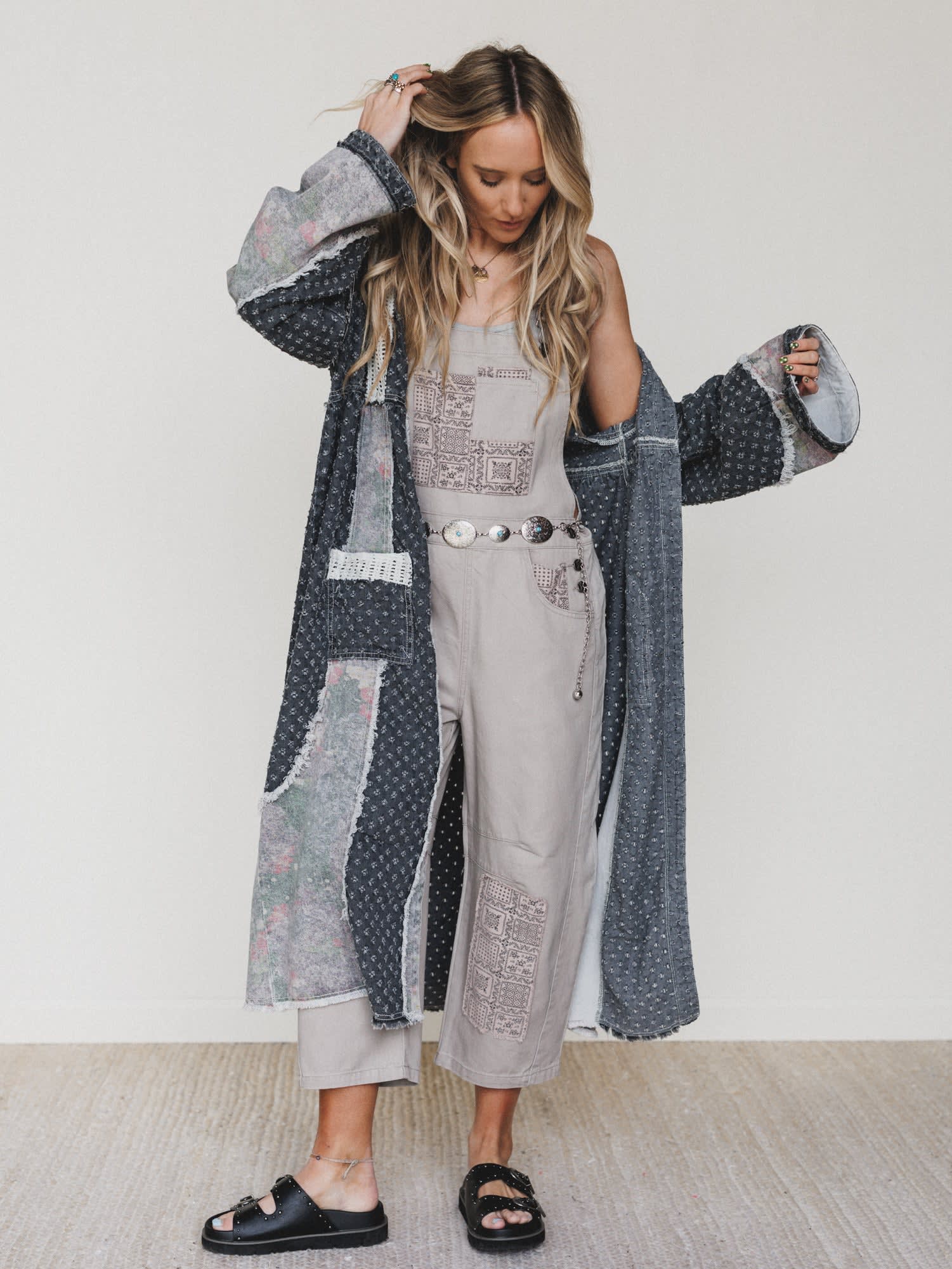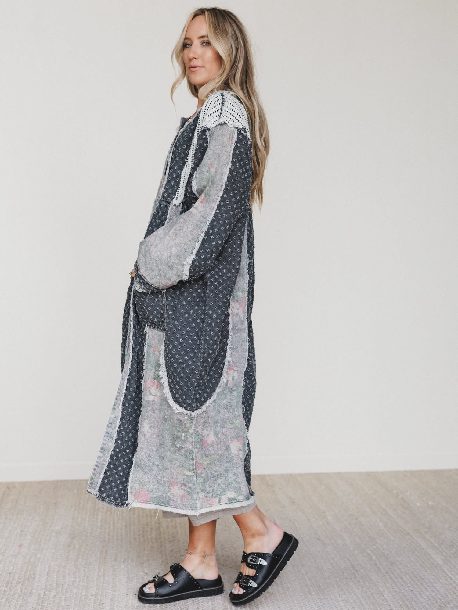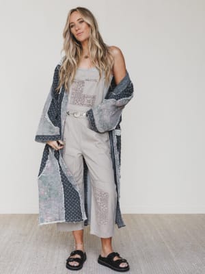 - Night Owl Jacket in mixed charcoal tones with textured patchwork design, roomy front pockets, and relaxed open-front silhouette
