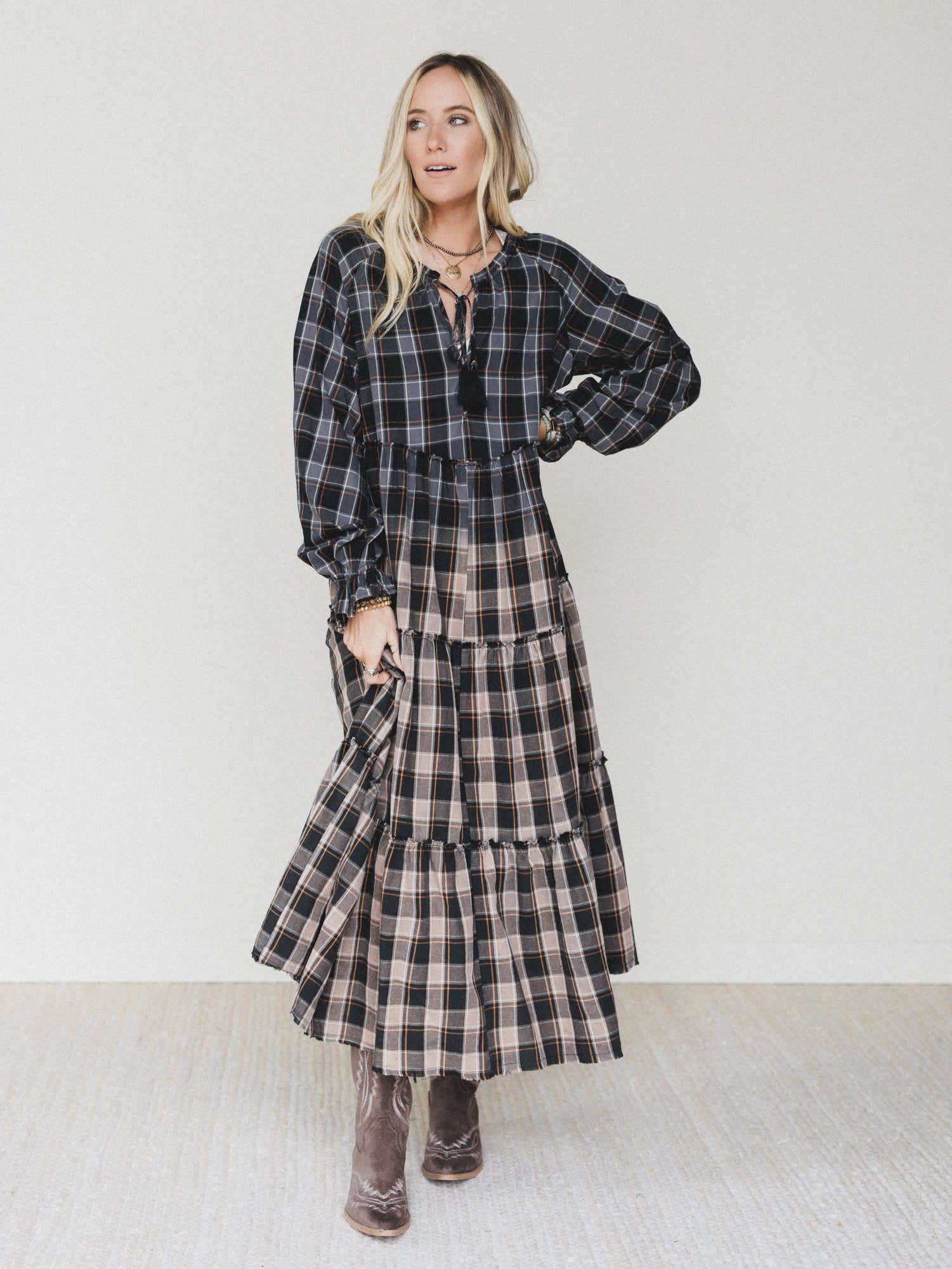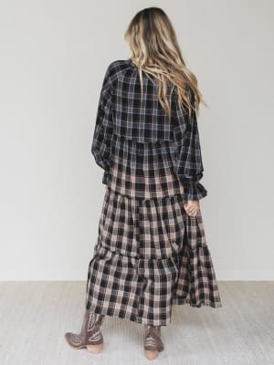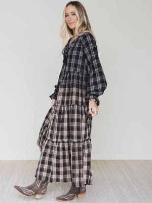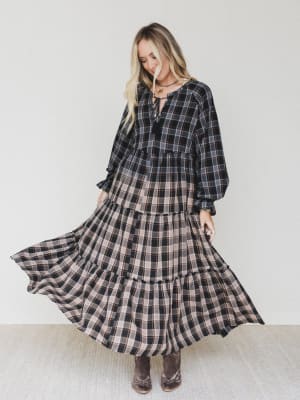 Meet the Sundown Harvest Tiered Dress — your new go-to for fall strolls, weekend markets, and slow country mornings. This easy, flowy maxi brings the charm of cozy plaid to a feminine silhouette, mixing classic vibes with free-spirited edge.