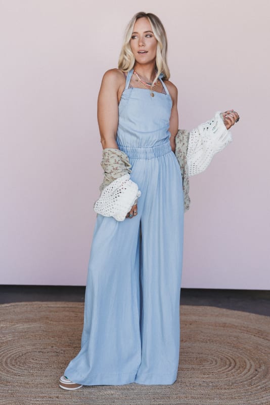 Pair this jumpsuit with a crochet kimono and platform sandals for a retro look.