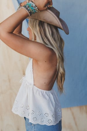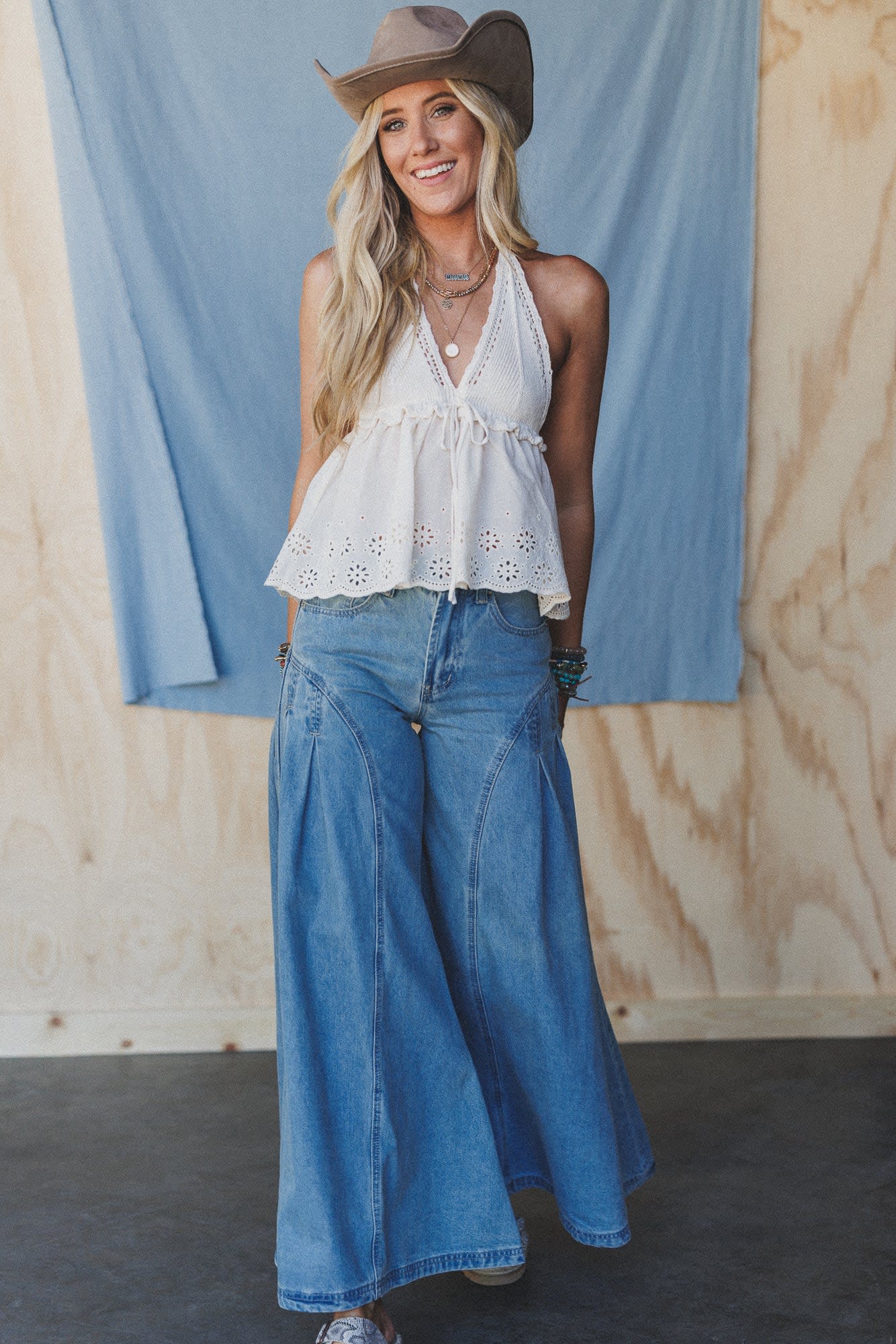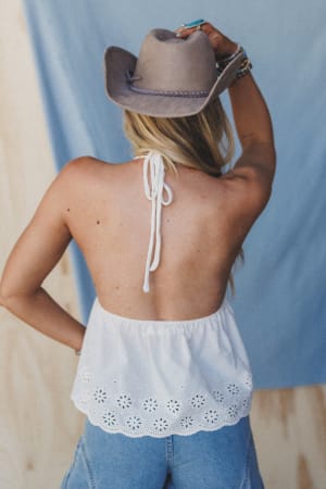 This flirty halter top features eyelet detailing and looks amazing with bell bottom jeans.