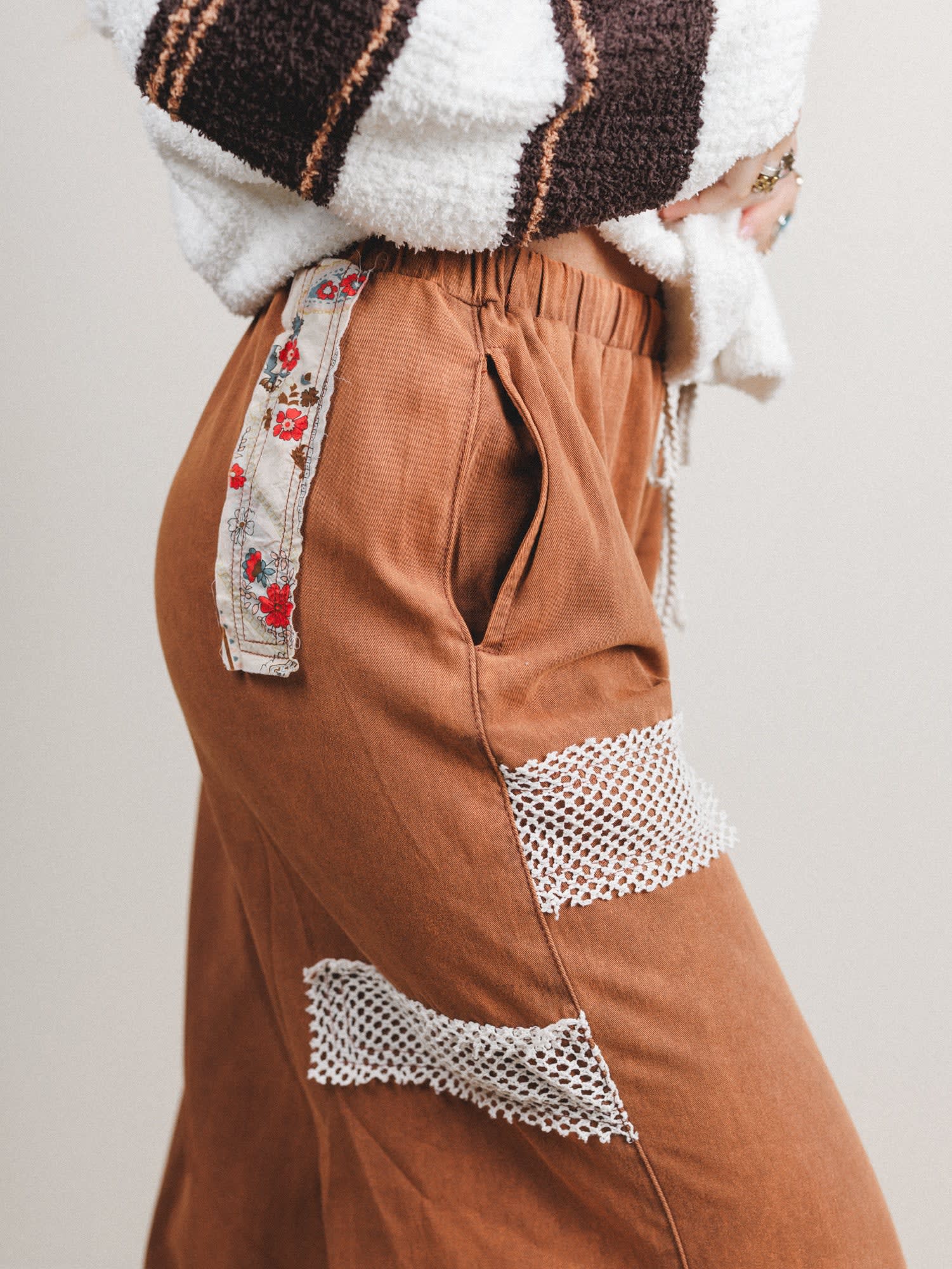 - Star Cool Pants (Rust): Laid-back joggers in a rich rust wash with oversized star patches, crochet detailing, and just the right amount of shimmer