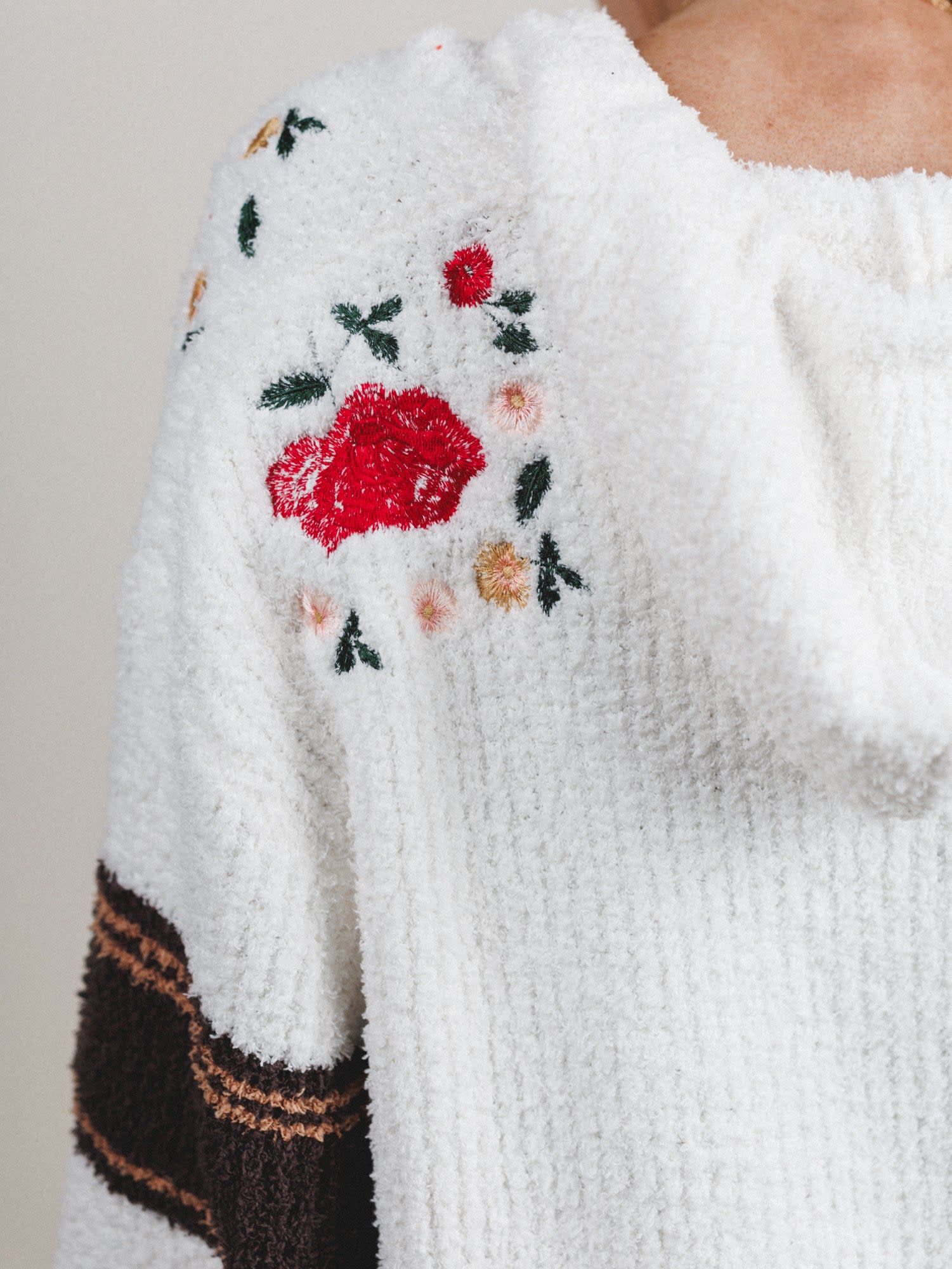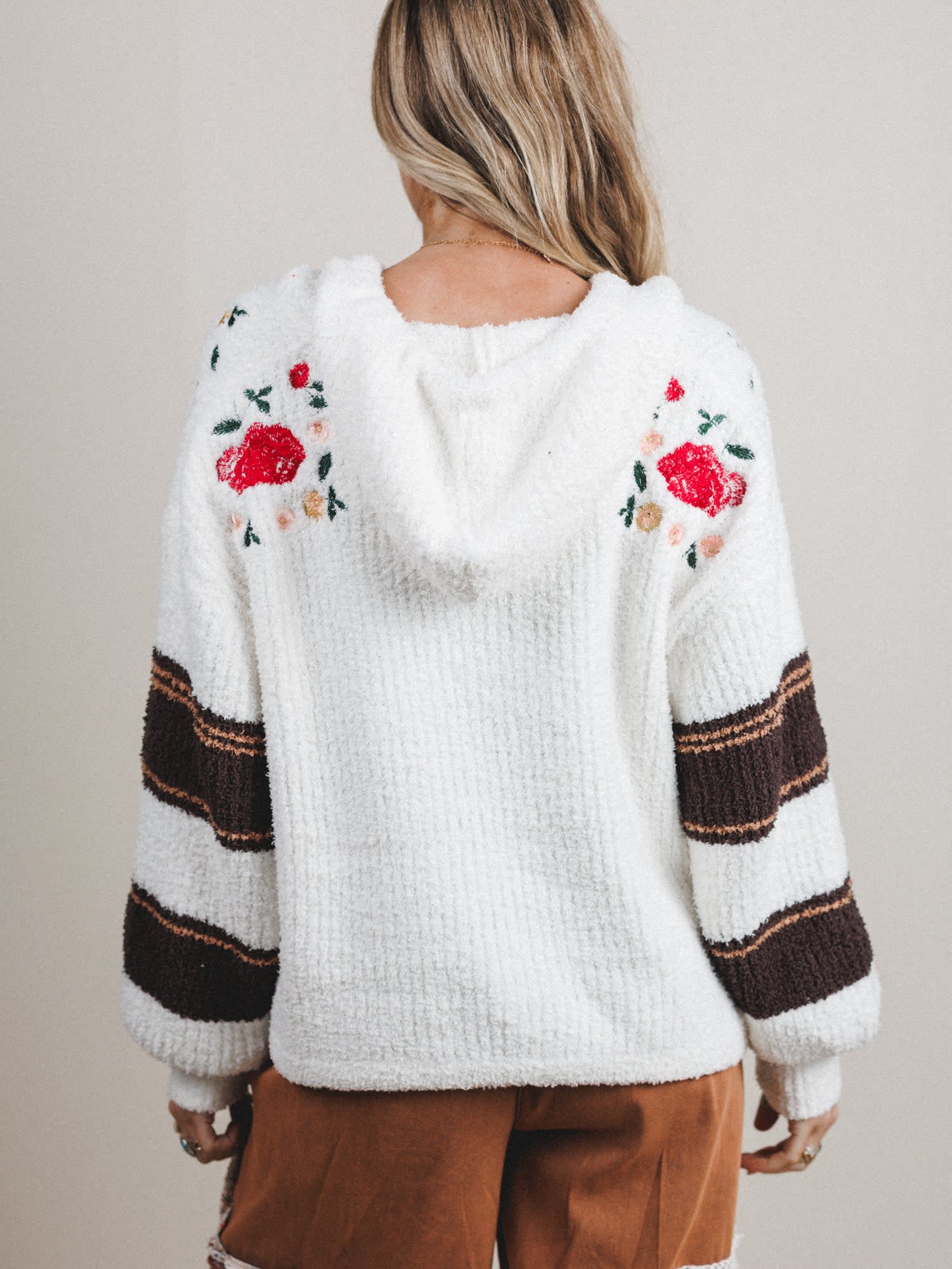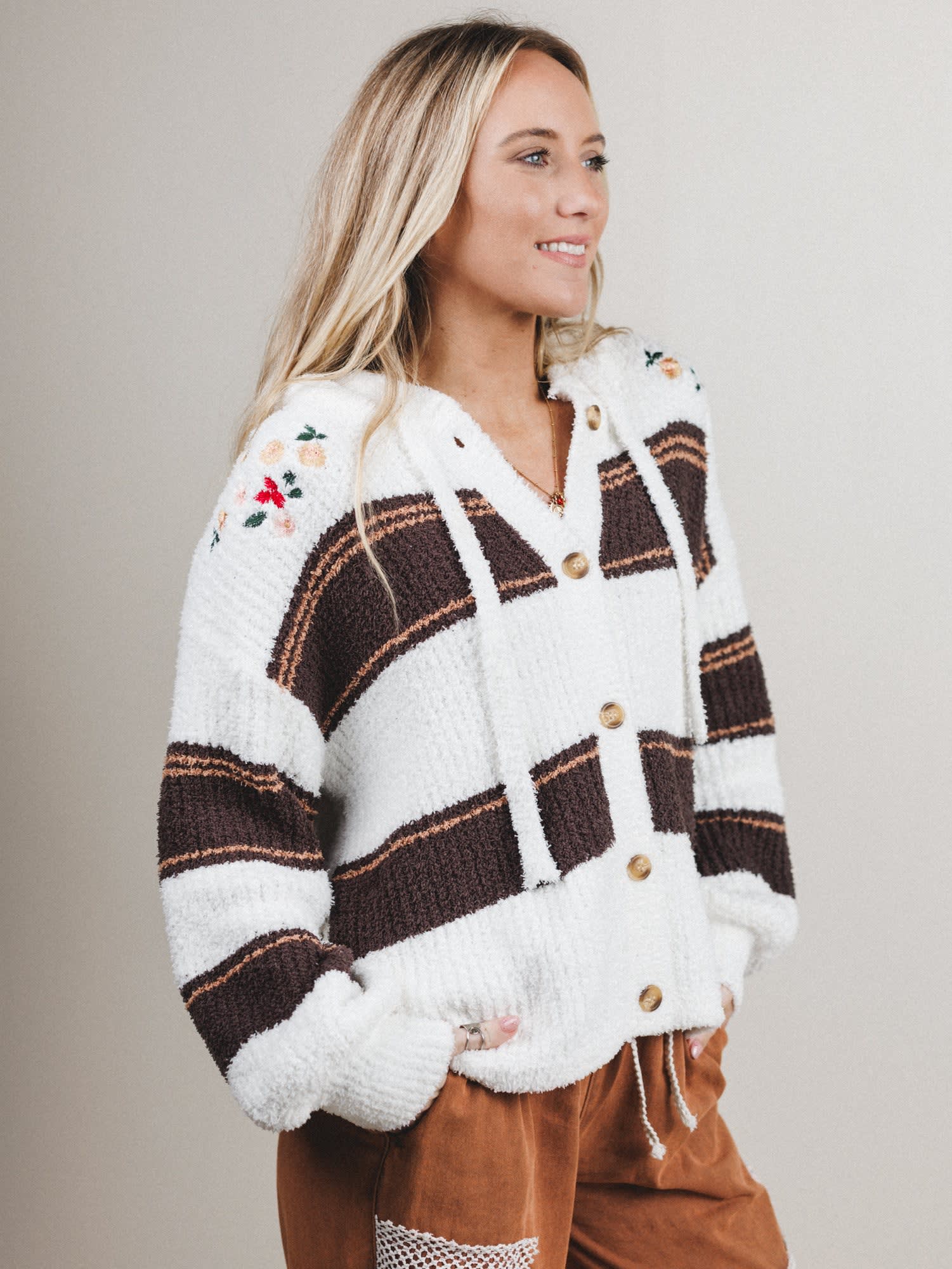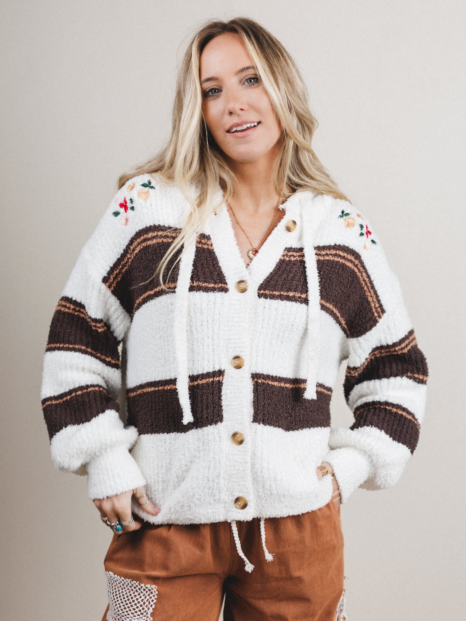 - Sunset Swell Sweater: A super-soft, striped button-up hoodie in warm neutrals with embroidered floral touches—chunky, cozy, and totally collectible