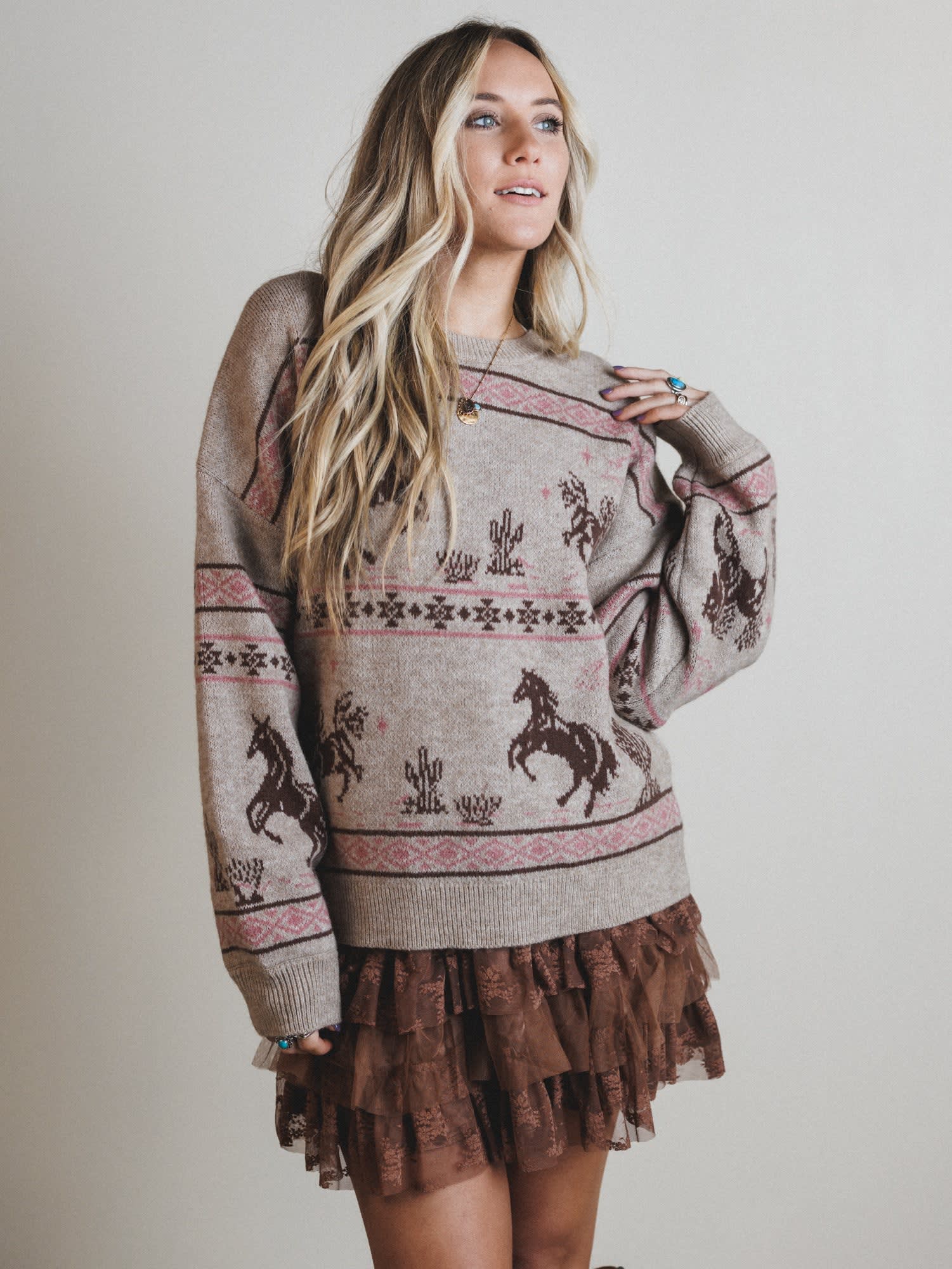 • Sunset Stride Sweater: Features wild horses and southwest patterns in a relaxed fit—your new go-to for layering over denim or dresses.
