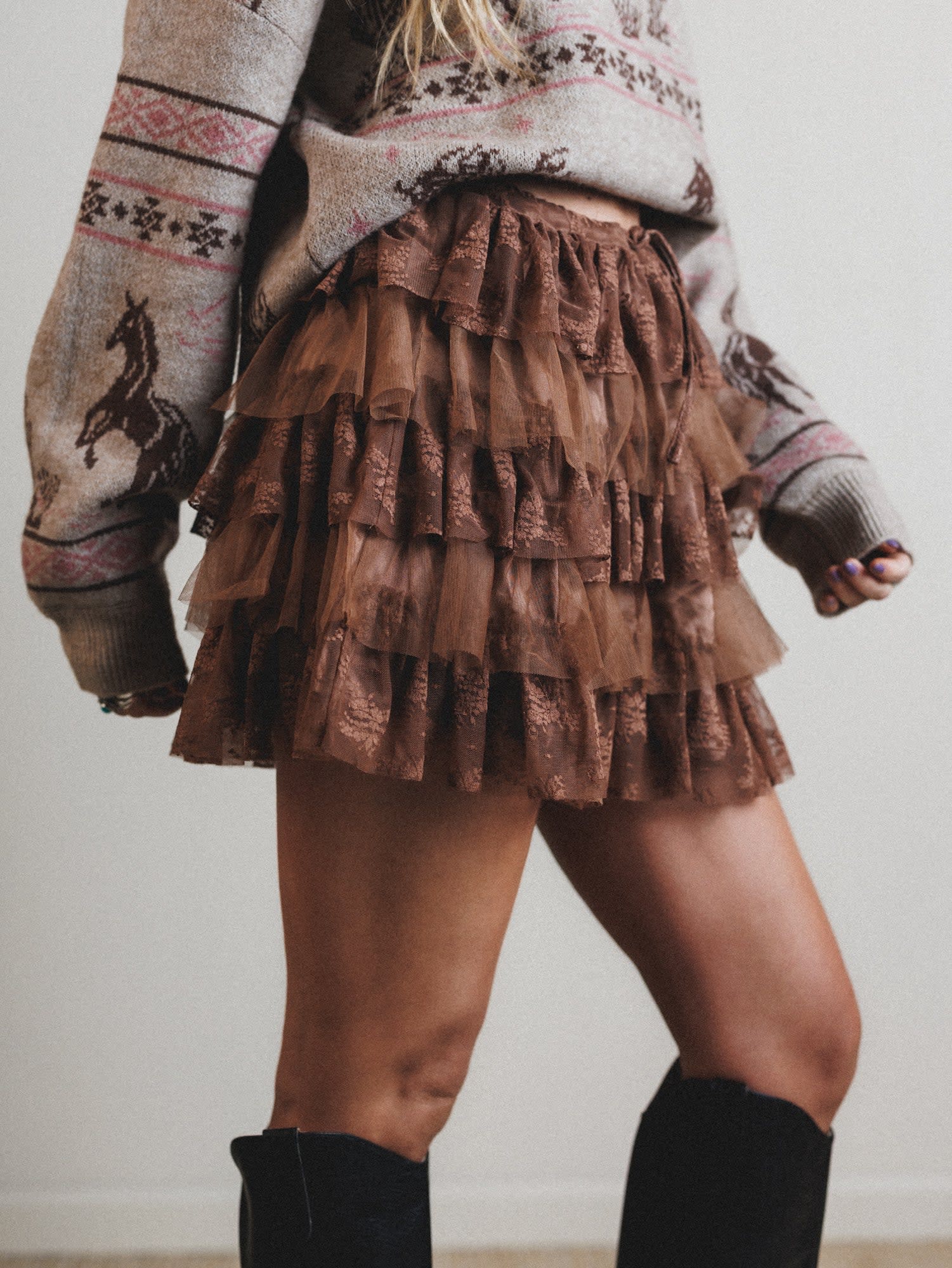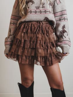 • Fairy Parade Tiered Ruffle Mini Skirt: This mocha lace mini brings flirty movement and a comfy drawstring waist—so easy to style with boots or a bralette.