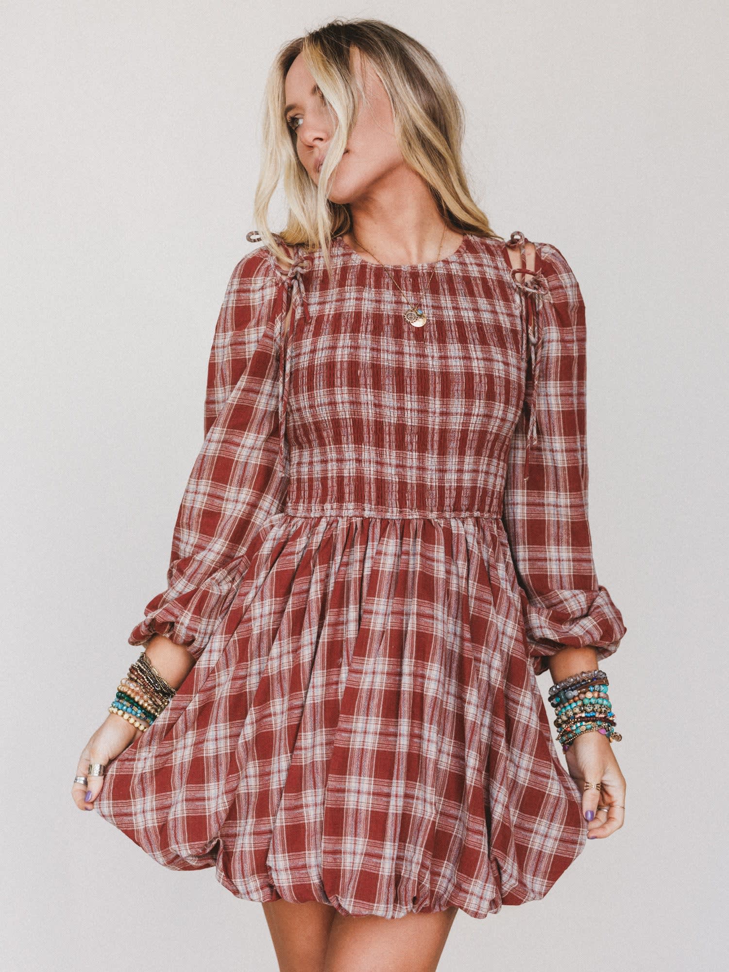 Bring all the cozy charm of autumn into your wardrobe with the Sunset Rust Plaid Dress. This ultra-soft mini is made for those in-between days when you want to feel cute and comfortable without trying too hard. With vintage prairie vibes and thoughtful details, it’s a closet essential with boho soul.