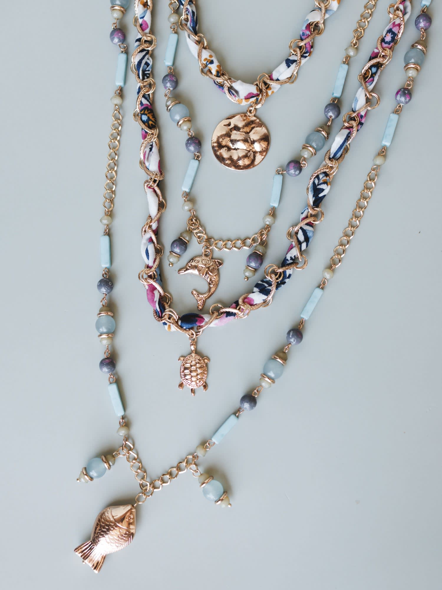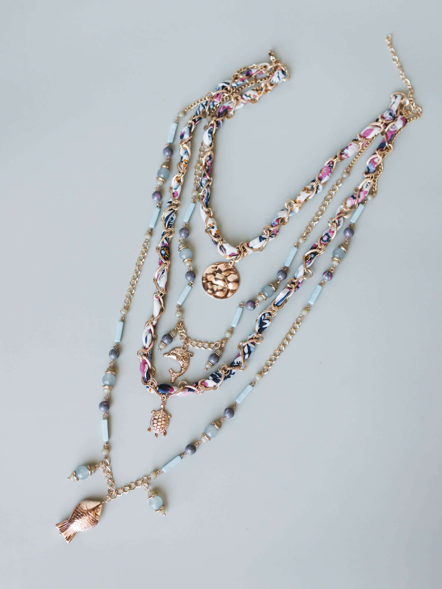 • Features multiple strands with mixed chain lengths and textured beading for dimensional layering.